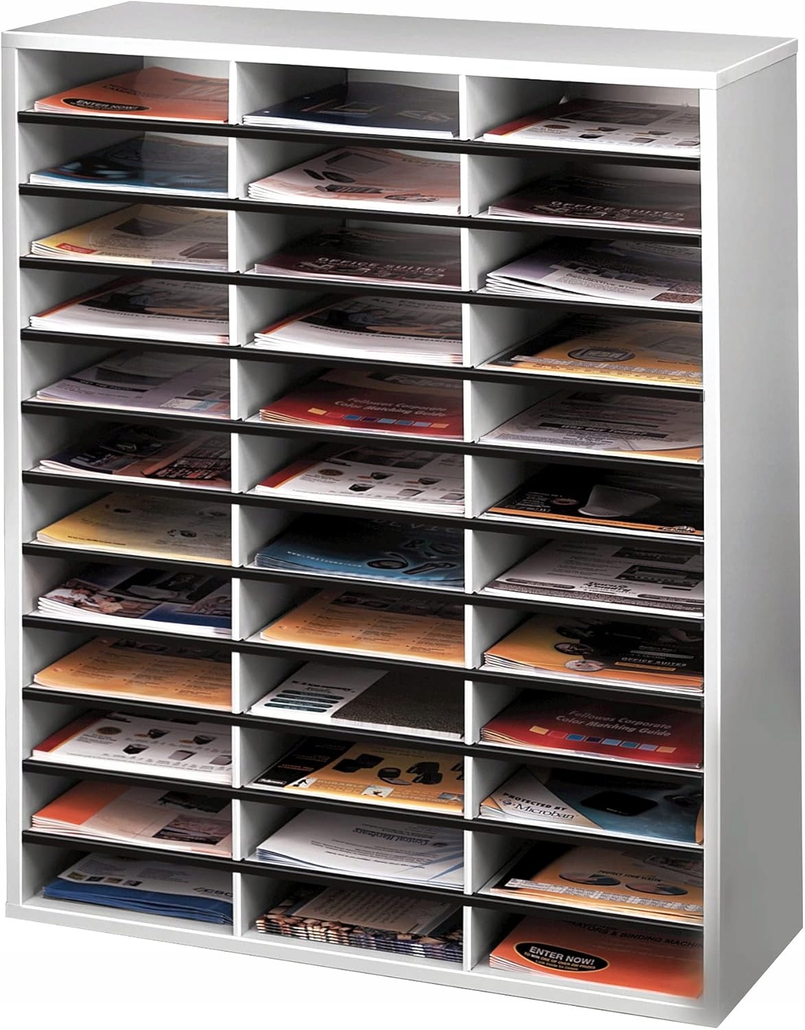 Сортування полиць для пошти та брошур, стабільна конструкція, виготовлена з ДСП з меламіновою поверхнею та відсіками від гофрованої плати, доступної у 3 розмірах: 24, 36 або 72 відсіків, поля для опису кожного відділення. Доставка: одиниця з 36 відділеннями.
