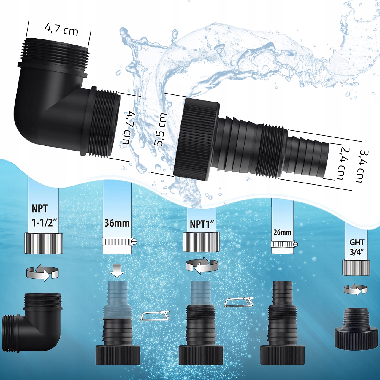 - Rрізні варіанти випускунасос для гнучкості під час встановлення - універсальний шланговий з’єднувач