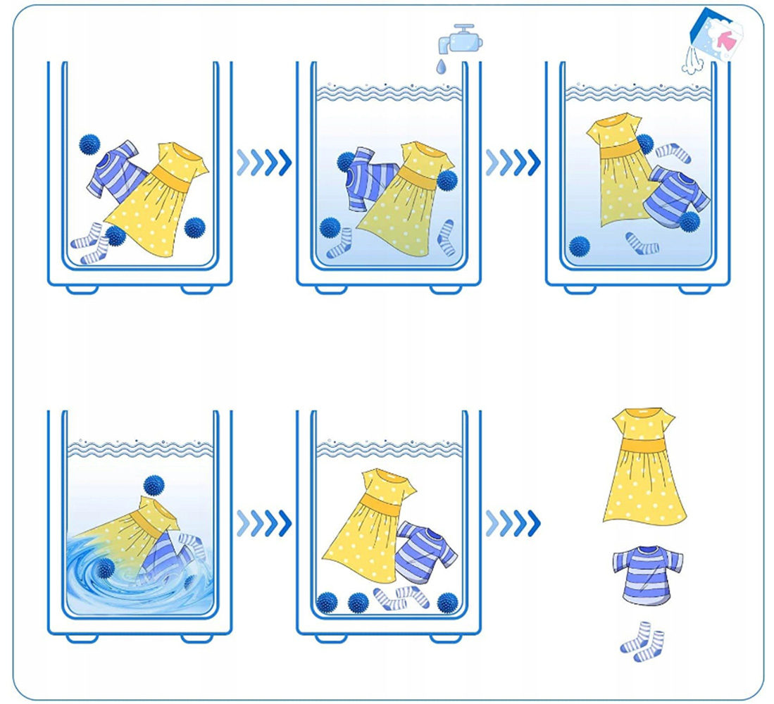 Кульки призводять до зменшення електроенергії та води споживання та кількість рідини для полоскання. Пральні кульки зберігають тепло, передаючи його одязі, тим самим прискорюючи процессушіння тканин. М'ячі багаторазові, просто помістіть їх у пральну машину разом із білизною.