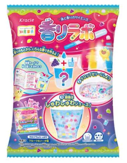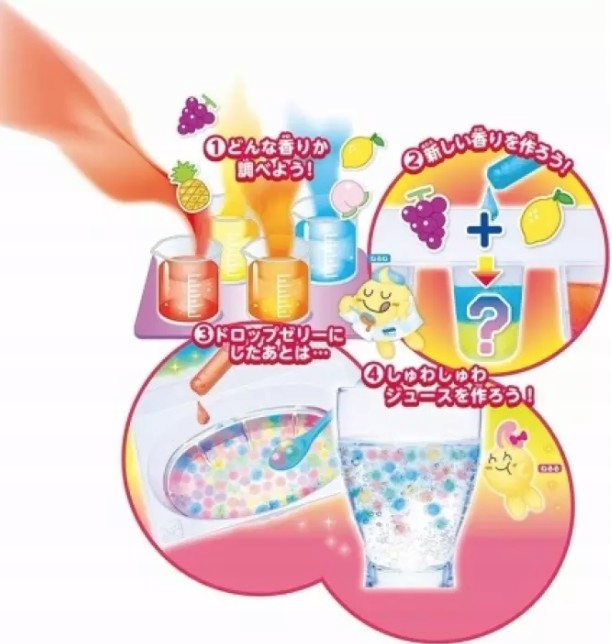 зараз, і ти можеш бути вченим! Завдяки фруктовому набору Labo ви створите лабораторію у своєму будинку. Цей набір дозволяє поєднувати сиропи з різними смаками, щоб отримати загадкові кульки з желе в газованому напої! Коли ви змішуєте порошки та воду, будуть створені супер гумові кульки. Ви можете створити кілька кольорів, які ви потім змішаєте з блискучим порошком "Shuwa-Shuwa", щоб закінчити ціле барвистим і смачним газованим напоєм.