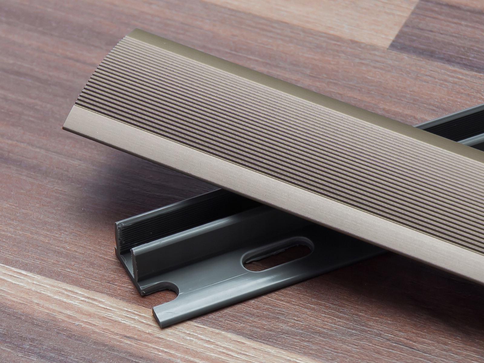 Профіль побудований за системою з двох частин, що складається з основного декоративного профілю та монтажної планки. Така конструкція також дозволяє регулювати висоту і кут нахилу профілю. Цілийдозволяє маскувати деформаційні шви глибиною 7-15мм і шириною до 34мм, а також нівелювати перепади висоти основи до 6мм.