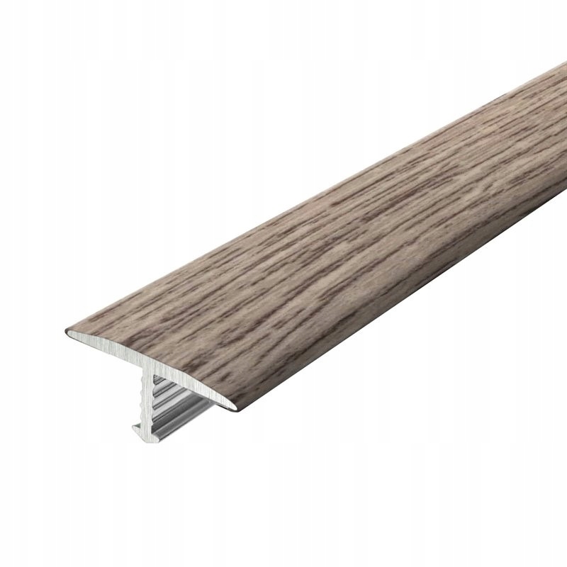 Т-подібний поріг "Т-брус" - ефективно та дуже непомітно з'єднує підлогу панелі, наприклад, у дверному отворі. Це так званий Т-подібний профіль – доступний у найпопулярніших кольорах підлоги. Водонепроникний, дуже міцний деревний шпон назавжди приклеєний до алюмінієвої смуги, створюючи настільки міцний виріб, що він буде виглядати як новий протягом багатьох років.
