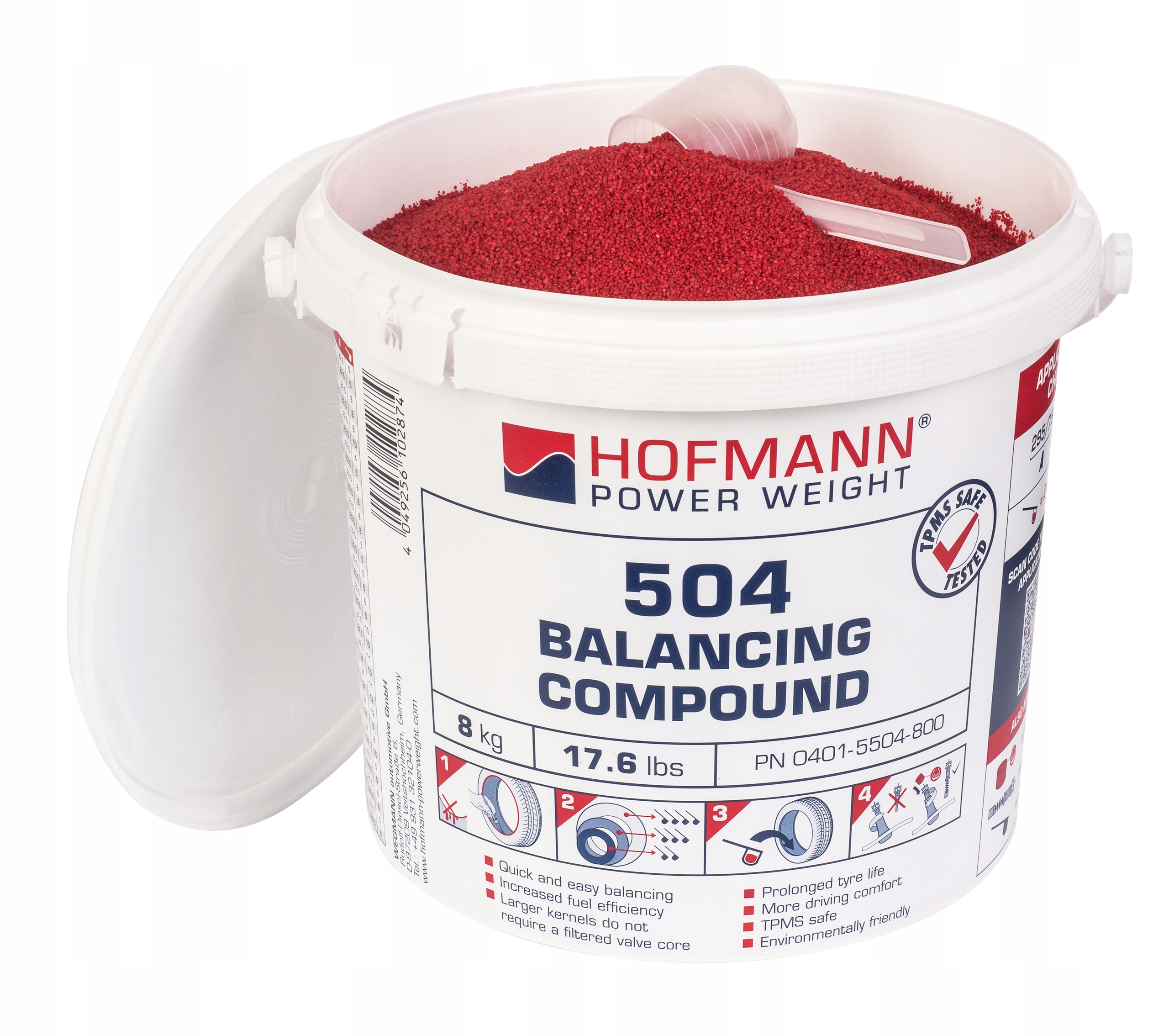 Використання порошку Hofmann Power Weight type 504 дозволяє швидко та легко проводити балансування коліс комерційного транспорту, коли шина монтується на ободі, без необхідності маневрувати важкими колесами на балансувальній машині та без необхідності інвестувати в балансир коліс. Використання гранул для балансування має й інші практичні аспекти - майстерні не потрібно тримати запас різного роду гир, що економить час і гроші.