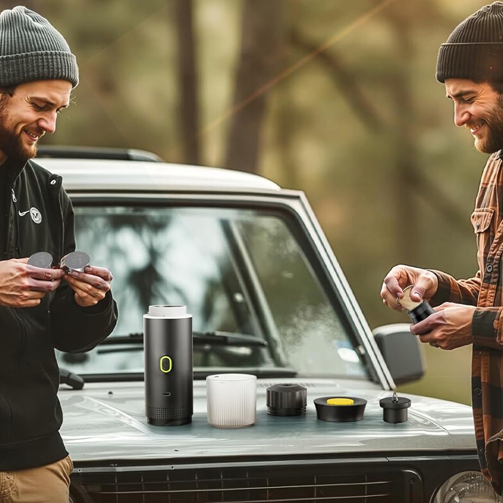 - ✨ Кавоварка на одну чашку оснащена вбудованим акумулятором, який усуває потребу в доступі до розетки. Після повного заряджання його можна носити по бездротовому зв’язку та використовувати будь-де.