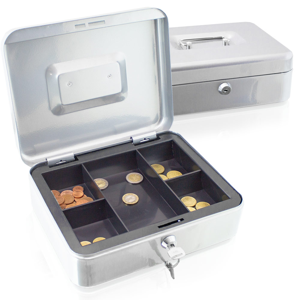 СУДОВНА КАСЕТА ДЛЯ ТРАНСПОРТУВАННЯ ТА ЗБЕРІГАННЯ ГОТІВКИ 25 CMUNOTE - коробка вміщує лише монети євро! Абсолютно нова, високоякісна металева коробка для зберігання та транспортування монет, банкнот чи інших цінних речей. Міцний і зручний металевий футляр, оснащений Сортувальник монет - ідеальне місце для зберігання банкнот і монет. Внизу багато місця, наприклад, для купюр, квитанцій, монет, банкнот та інших корисних речей. З метою безпеки ящик закривається на замок. Ергономічна ручка робить транспортування легким.
