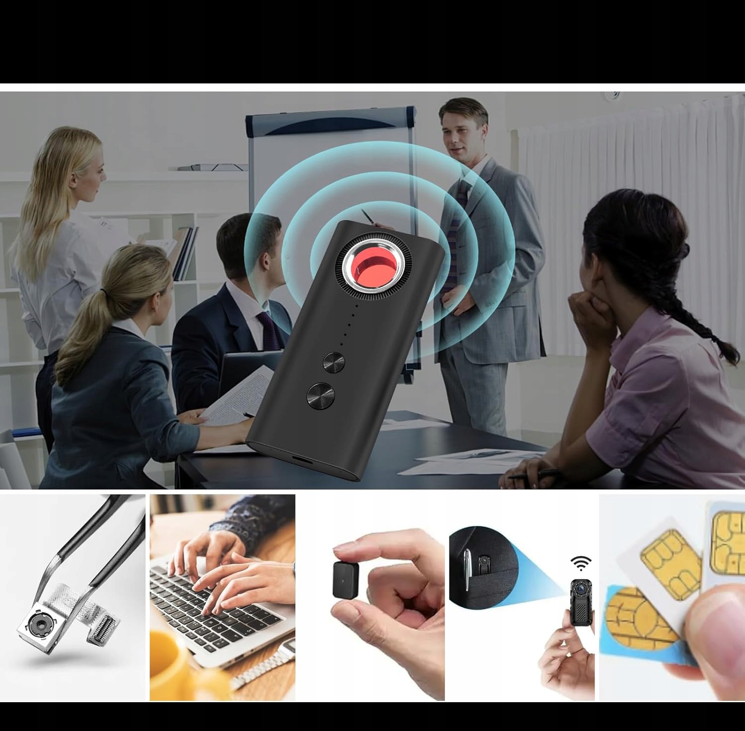 Виявити RF -сигнали для виявлення активного підслуховування RF, таких як бездротові підслуховування аудіопристроїв. Пошукова система камери для відстеження прихованих отворів та інфрачервоних камер. Він також може бути використаний для виявлення небажаних магнітних локаторів GPS.