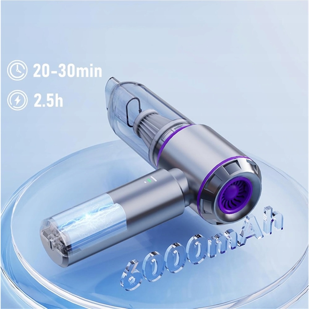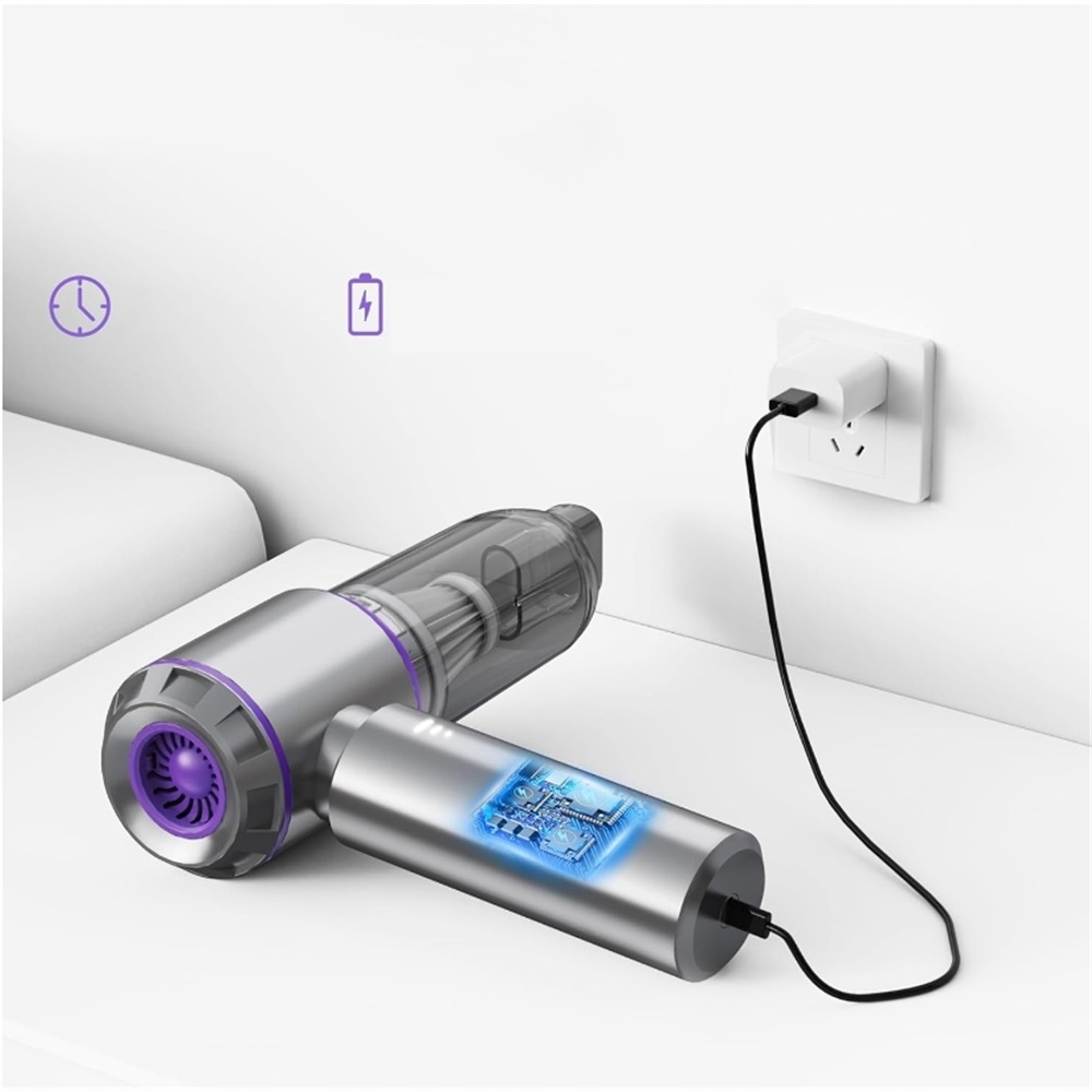Цей міні -вакуумний очищувач оснащений акумулятором потужністю 6000 мАг і підтримує зарядку type c . Його можна повністю зарядити за 4 години з адаптером 5 В/2 і може використовуватися майже 35 хвилин. Оснащений зарядним кабелем type-c , Ви можете заряджати його в будь-якому місці за допомогою USB-розетки , будь то в машині чи вдома.