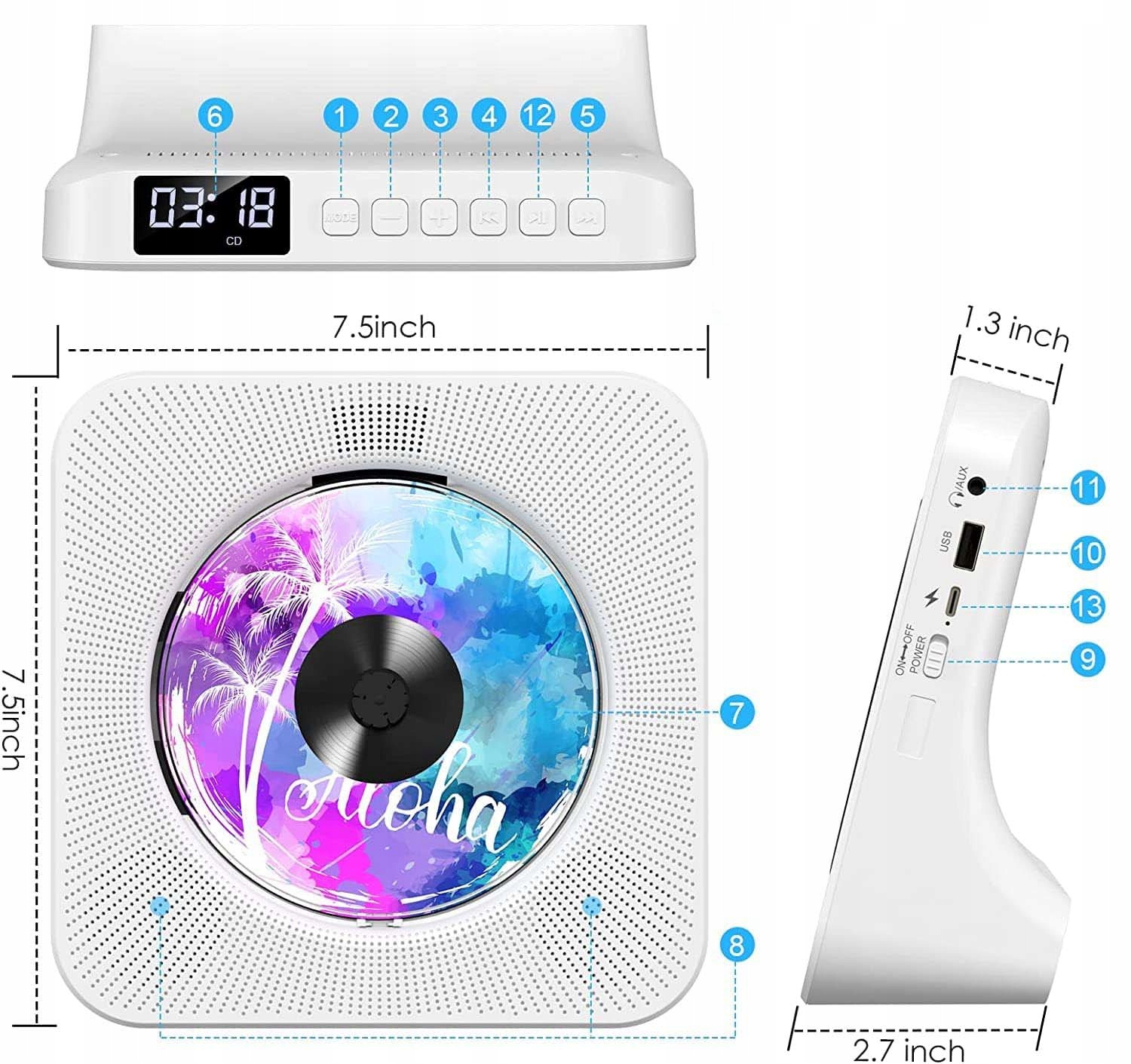 - - Широка сумісність: підтримка аудіоформатів CD/MP3/WMA/CD-G. Також підтримує USB, Bluetooth 5.0 (мобіль/планшет/ноутбук/AirPods) і FM-радіо (76-108 МГц).