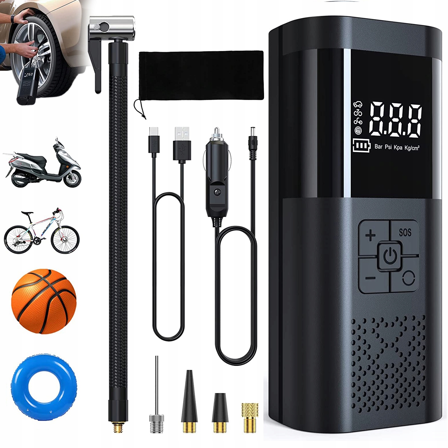 - Повітряний компресор постачається з 4 додатковими адаптерами для накачування автомобільних шин, шин мотоциклів, велосипедів, плавальних кілець, каяків, футбольних м’ячів, баскетбольних м’ячів, дитячих басейнів, спальних мішків, наметів тощо.
