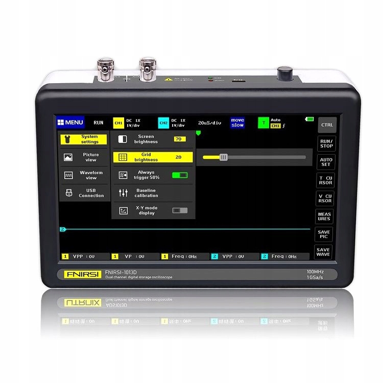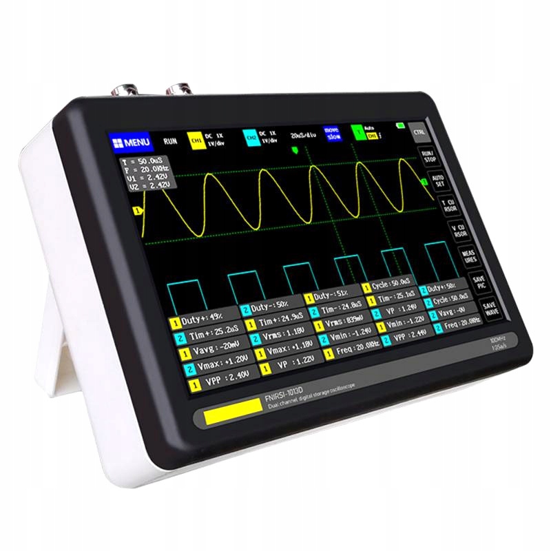 Цифровий осцилограф FNIRSI 1013D у формі планшета. Портативний пристрій, що дозволяє вимірювати без джерела живлення. Двоканальний осцилограф із смугою пропускання 100 МГц для кожного каналу та частотою дискретизації 1 Гвиб./с. Сенсорний TFT LCD екран з діагоналлю 7" і роздільною здатністю 800 x 480 дозволяє швидко і легко користуватися пристроєм. Ємнісний сенсорний екран також підтримує жести. Вбудована пам'ять 1 ГБ дозволяє зберігати до 1000 скріншотів та до 1000 форм сигналу Інтуїтивно зрозуміле меню для легкого керування Функція автоматичного керування дозволяє регулювати такі параметри, як розгортка часу або чутливість до напруги за допомогою однієї кнопки Довжина запису пам’яті становить 240 кБ Вбудований акумулятор ємністю 6000 мАг дозволяє віддалено працювати до 4 години без перерви. Час заряджання становить лише 5 годин. Максимальна напруга, яку можна подати на вхід вимірювання, становить 400 В з подільником x10 або 40 В з подільником x1. Система захищена від перенапруги та безперервних вимірювань до 400 В. Вбудований -введення курсорів і автоматичне вимірювання 12 параметрів.Три режими запуску: Нормальний, одиночний і автократичний з наростаючим або спадаючим фронтом.Пристрій має можливість експортувати файли через USB на комп'ютер. Після підключення пристрою файли видно в папці. Завдяки цьому ми можемо легко експортувати файли знімків екрана та збережені сигнали. Невеликі розміри і вага роблять пристрій ідеальним для мобільного використання і для людей, які цінують незалежність від джерела живлення і відсутність необхідності підключати додаткові кабелі. Осцилограф також працює, коли він підключений до джерела живлення, тому під час роботи, коли батарея вже розряджена, ви можете живити його за допомогою блоку живлення або зарядного пристрою.