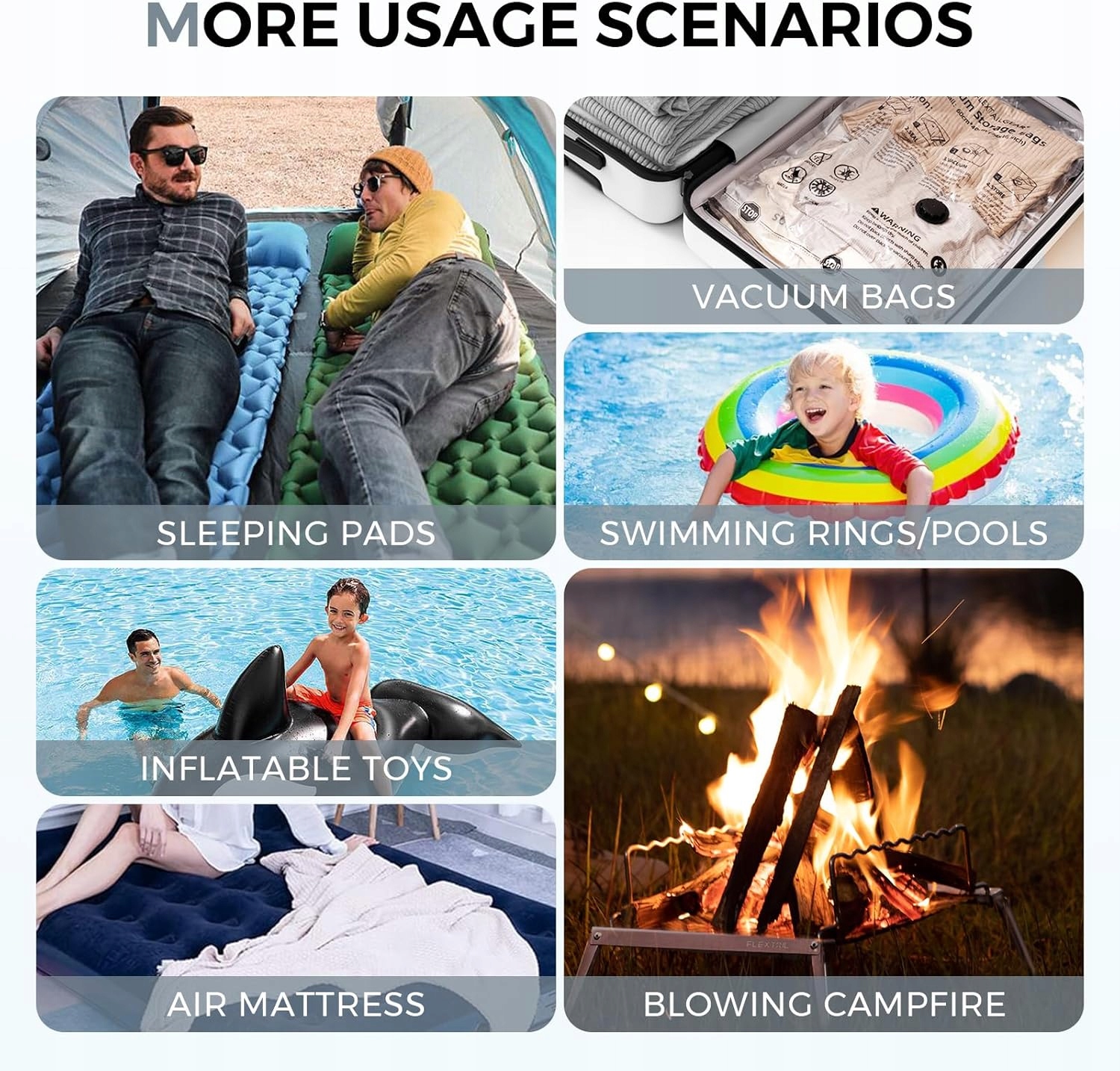 Здатність надути 4-5 плавальних кілець, 6-8 індивідуальних матраців, 1-2 товсті подушки безпеки або здути 10-12 мішків для зберігання.