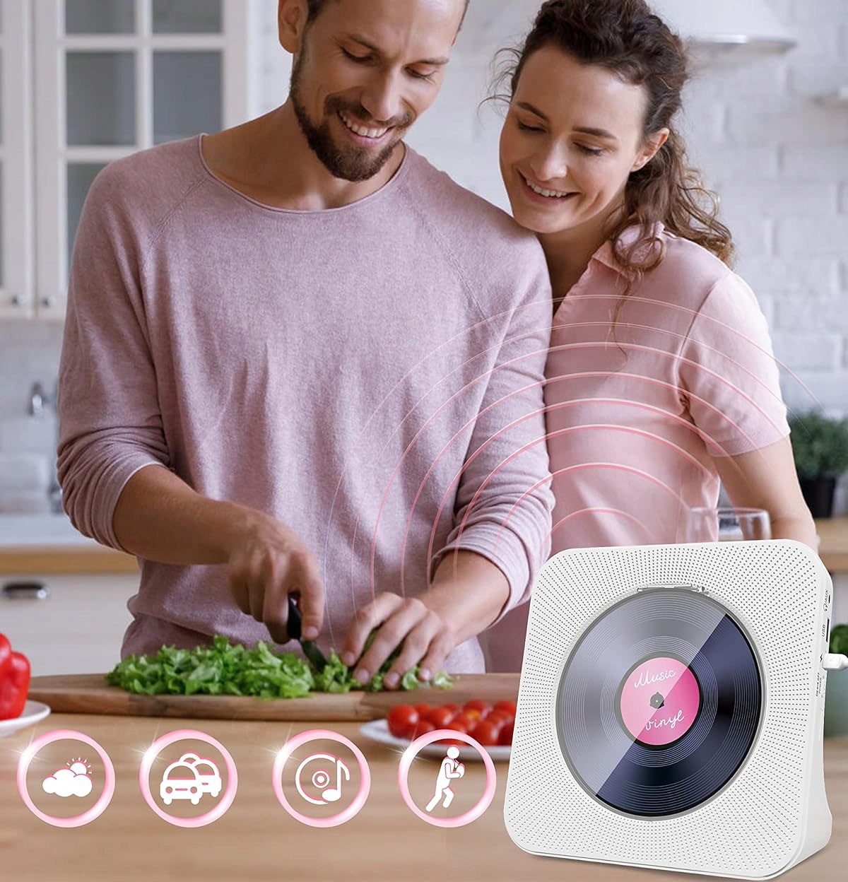 Плеєр CD на стіл може бути підключений до інших пристроїв, що підтримують технологію Bluetooth (мобільний телефон/планшет/ноутбук/airpods). Вбудовані стерео динаміки Hi-Fi дозволяють регулювати гучність залежно від ваших потреб. Примітка. Гравець CD повинен бути підключений або живлений від портативного джерела живлення.