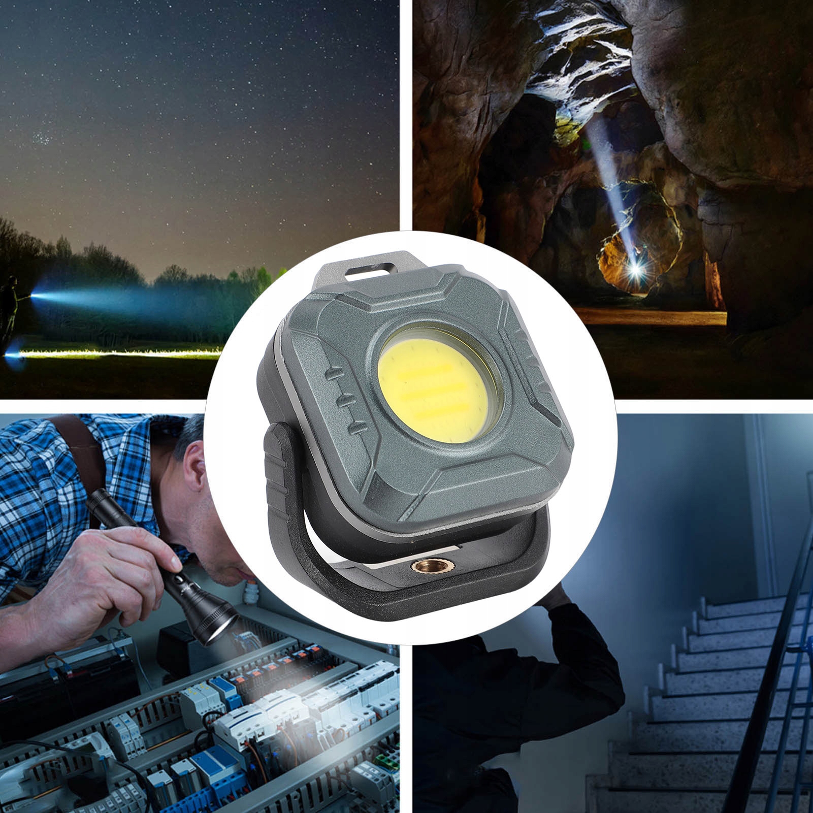 2. Обертальна підставка та водостійкість IPX5: Портативний магнітний світ має обертову стійку для гнучкості в розміщенні, з можливістю стояння, прикріпленим до металу або, якщо це необхідно. Виготовлений з матеріалу ABS, світ є водонепроникним IPX5 протягом тривалості в екстремальних погодних умовах.