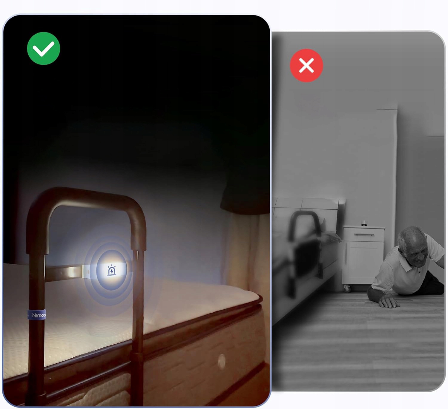 Компактна поручня для ліжка nimood забезпечує стабільну підтримку, ідеально підходить для людей похилого віку та людей з обмеженою рухливістю. Це полегшує самостійне сідання та вставання з ліжка, мінімізуючи ризик падінь і повторних травм. Це практичне рішення, яке щодня підвищує безпеку та комфорт.