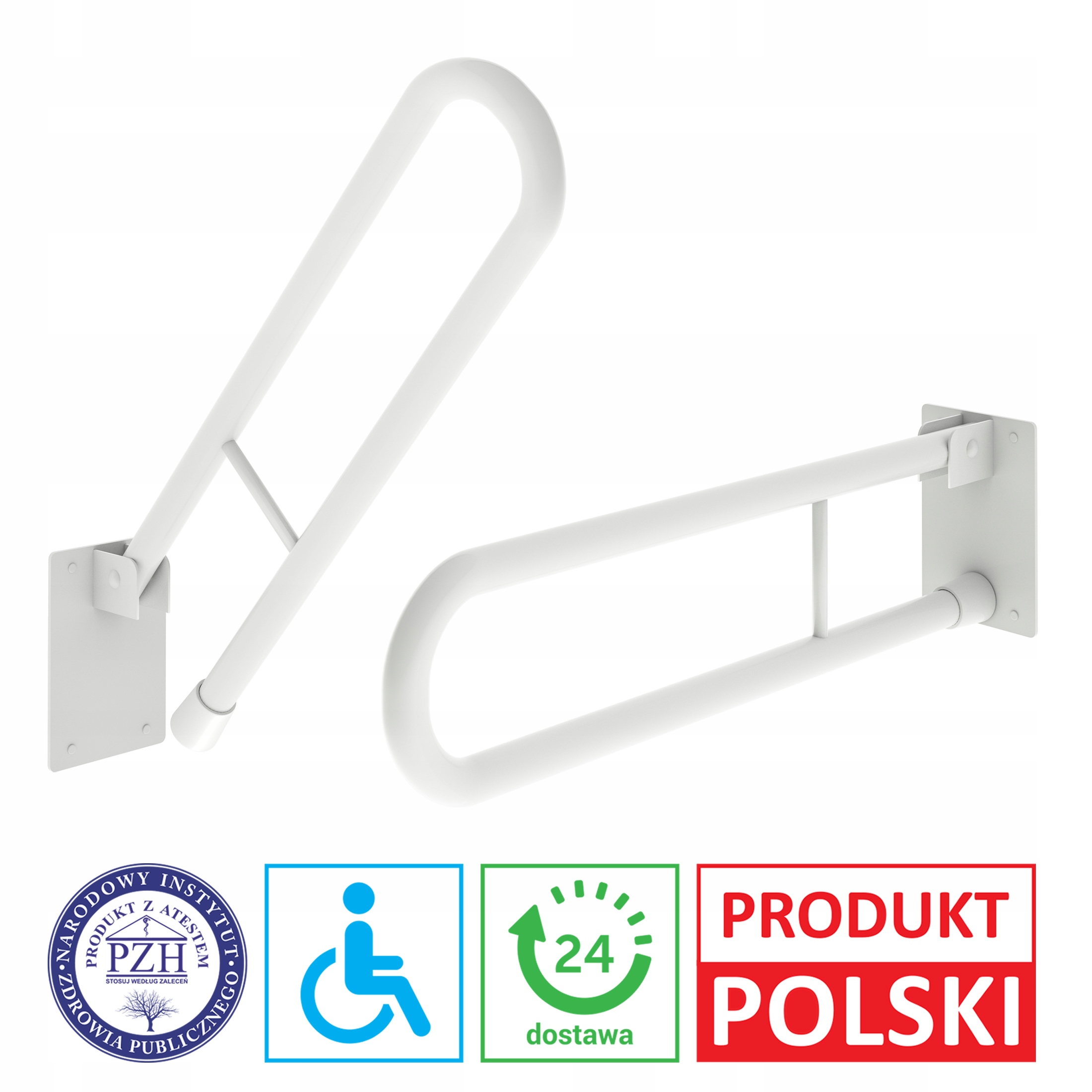 Поручень виготовлений з емальованої сталі (білого кольору). Виріб складається з дугоподібно зігнутої труби (діаметром 25 мм), металевої основи та кришки. Відкидний поручень, доступний різної довжини. Це відмінний вибір для людей, які шукають класичні та економічні рішення.