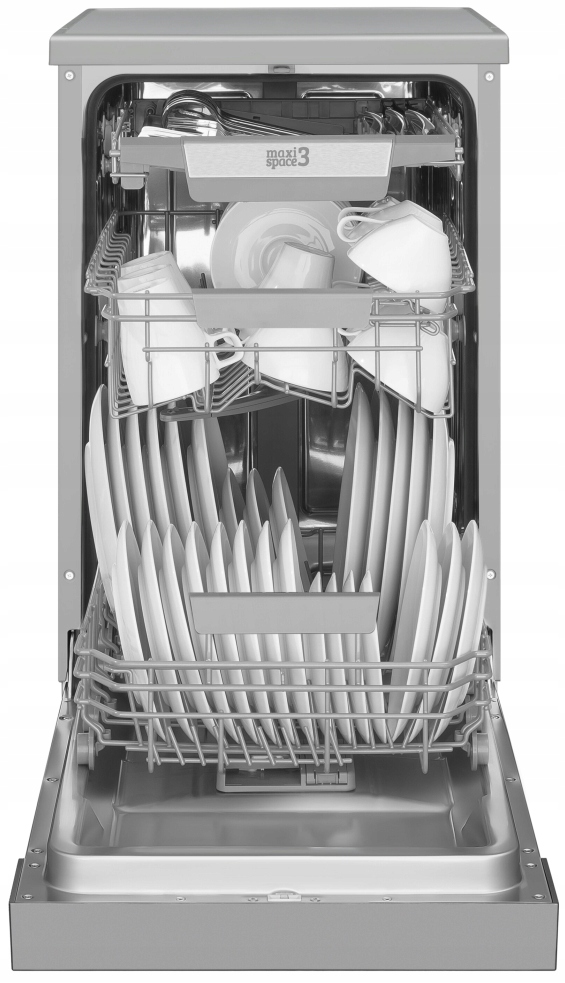Окремо стояча посудомийна машина, ширина 45 см, срібляста. 7 програм, половинне завантаження, відкладений старт, 3 корзини.