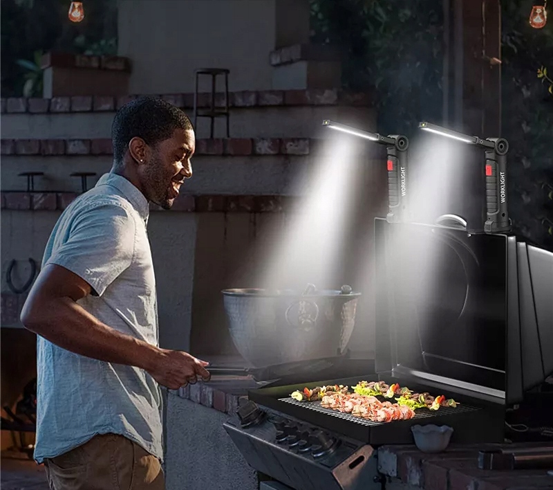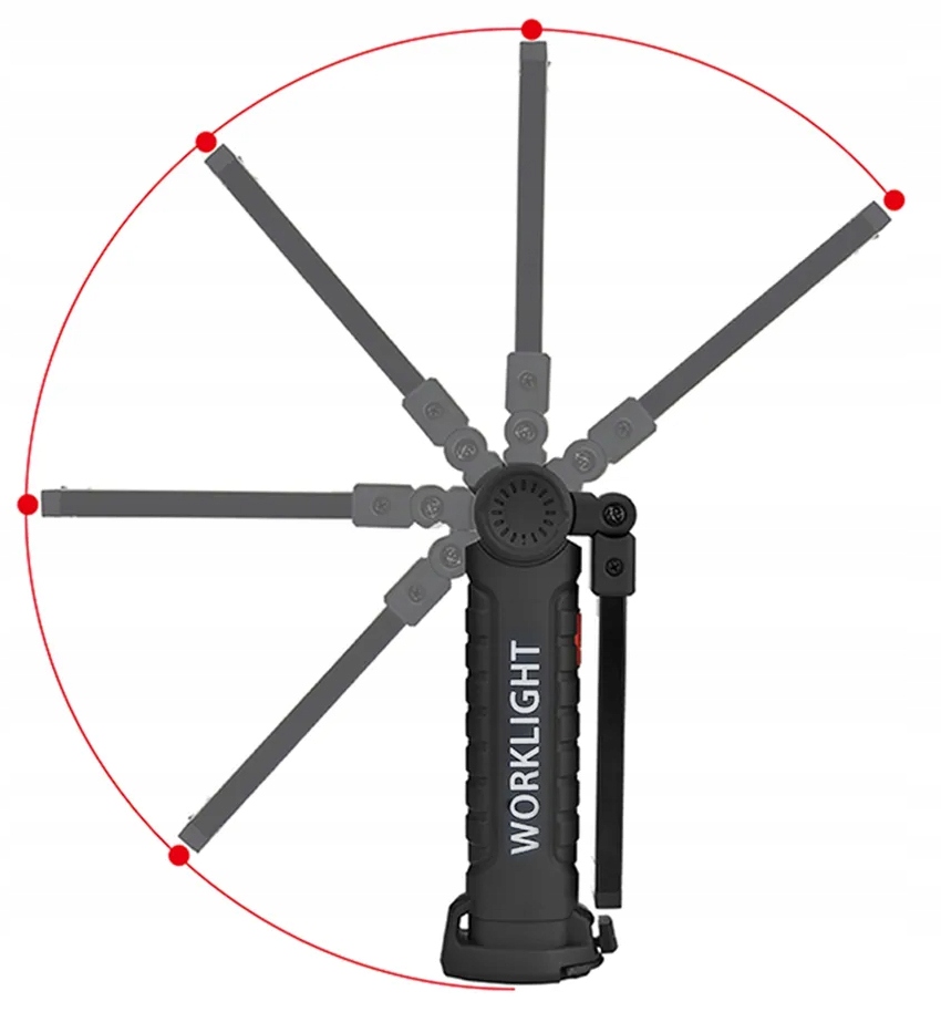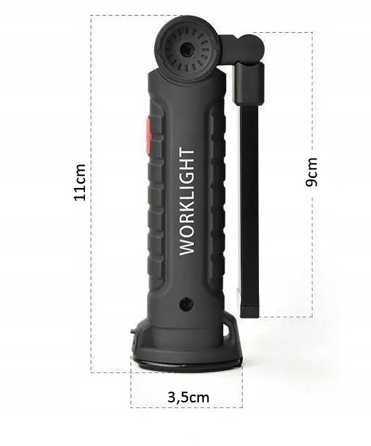 ⭐ Ліхтарик оснащений кількома функціями, які полегшують роботу, зокрема: гачок для підвішування, магніт або рухома головка з діапазоном рухів 270 градусів, завдяки чому можна направити світловий потік вправо напрямок. Крім того, він має світлодіодний діод на передній панелі, який дозволяє підсвічувати елементи у вузьких кутах.