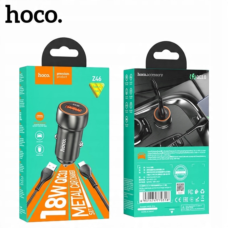 hoco Z46 Blue shieldце металевий, швидкий автомобільний зарядний пристрій потужністю 3A 18W, з одним роз’ємом USB у стандарті Quick Charge 3.0 / QC3.0, підтримує стандарти швидкої зарядки, такі як QC3.0 / QC2.0 / Huawei FCP або Samsung AFC. У комплект додатково входить кабель з роз'ємом USB Type-C / Type C довжиною 1 М / 100 СМ. Зарядний пристрій має додаткове підсвічування USB-гнізда зі світлодіодом.