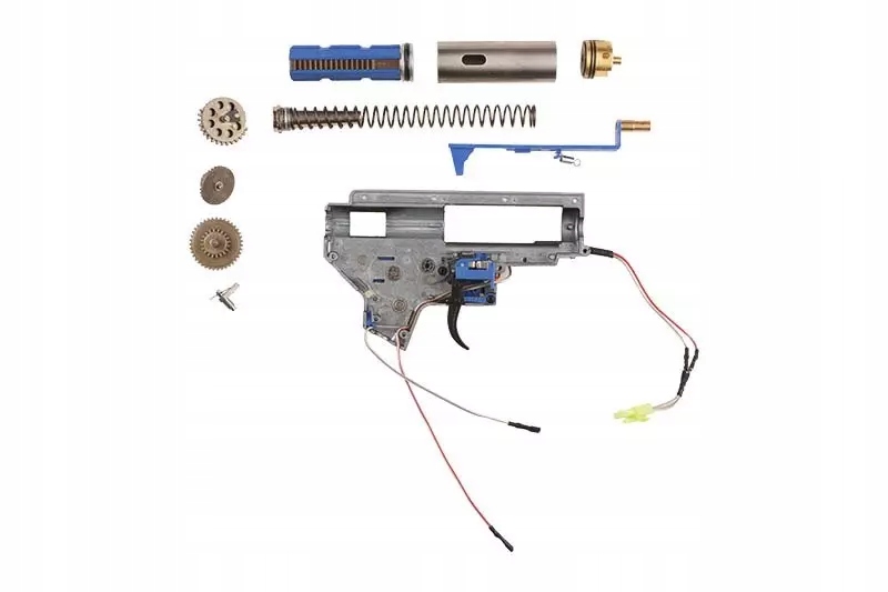 Повна, посилена коробка передач у версії v.2, присвяченій реплікам M4/M16. Це ідеальне рішення для людей, які хочуть купити якісну коробку передач за розумною ціною. Рама була пристосована для встановлення підшипників 8 мм, а завдяки посиленій конструкції в критичних місцях вона також може використовувати більш міцні пружини. Коробка передач має систему швидкої заміни пружин Enter & Convert™