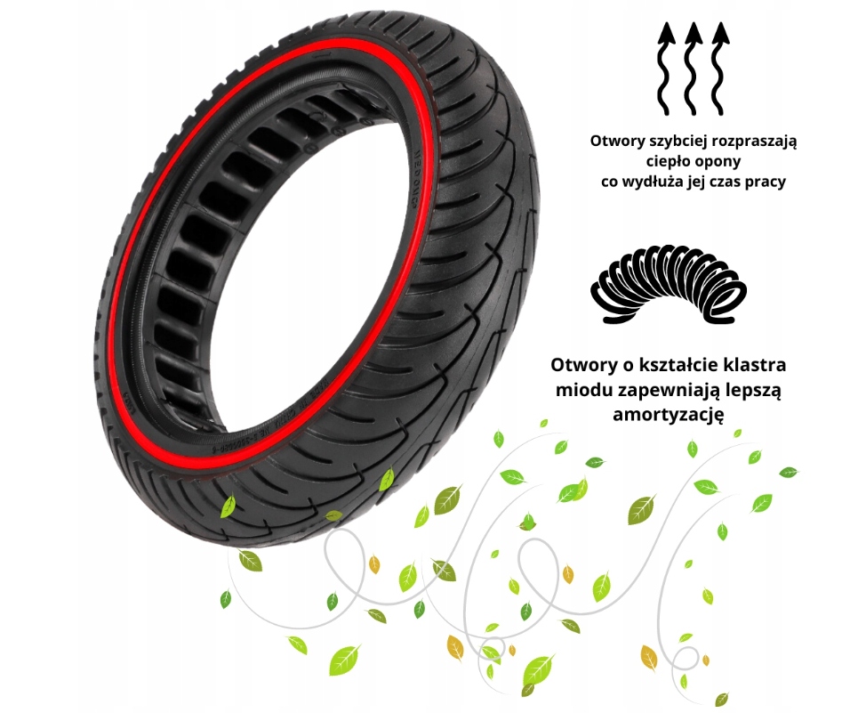 Ця безкамерна шина дуже стійка до пошкоджень і забезпечує виключний комфорт водіння завдяки своїй м’якості та порожньому простору всередині. Він виготовлений з м'якої гуми, що робить його легшим за популярні моделі перфорованих суцільних шин.
