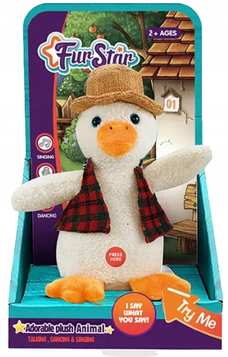 Качка повторює слова своїм кумедним голосом, змахуючи крилами та рухаючи головою! Коли ти тиснеш йому на животик, він грає веселі мелодії та танцює.
