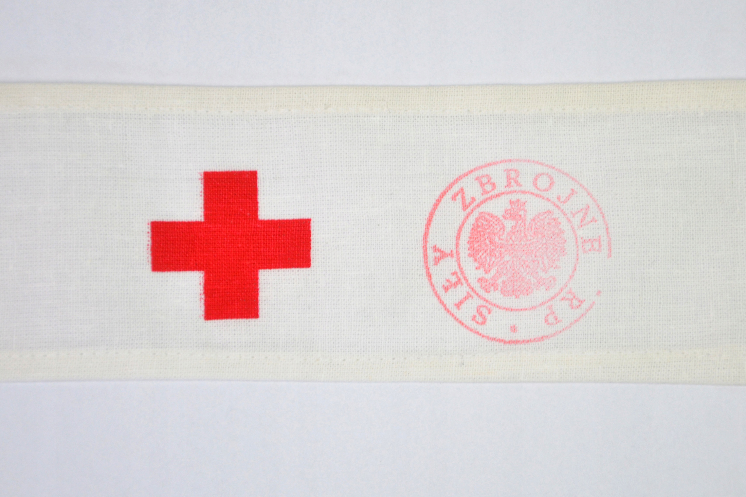 Пов'язка виготовлена з бавовняної тканини з великим червоним хрестом. Має бавовняні шнурки для зав’язування на руку.