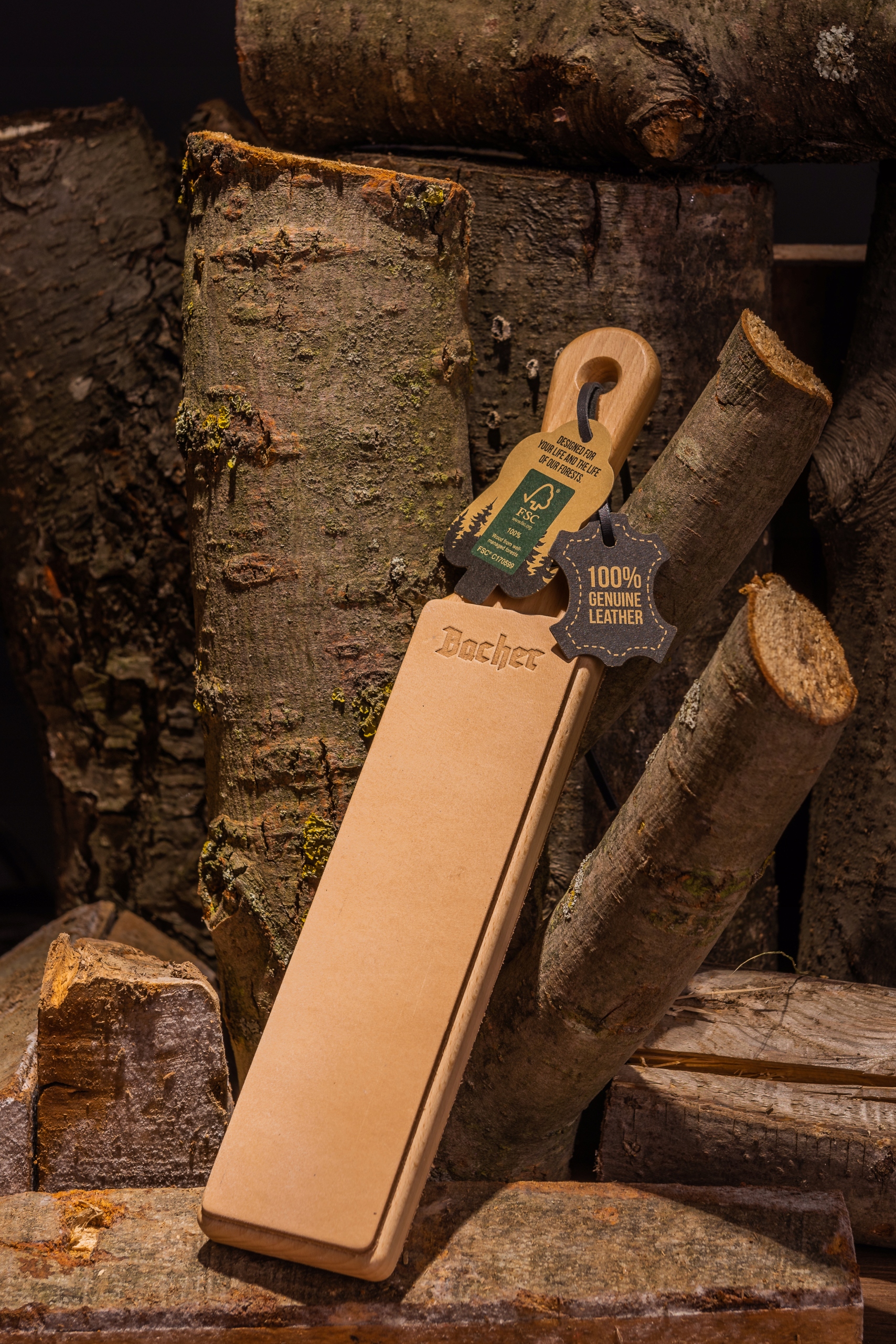 Шкіряна стеля -це аксесуар, який дозволяє ретельно відполірувати лезо після попередження. Ручний пояс, виготовлений із засмаглого овочів, худоба з товщиною товщиною 3 мм розміщена на твердій і міцній буковій дошці з бука. 4