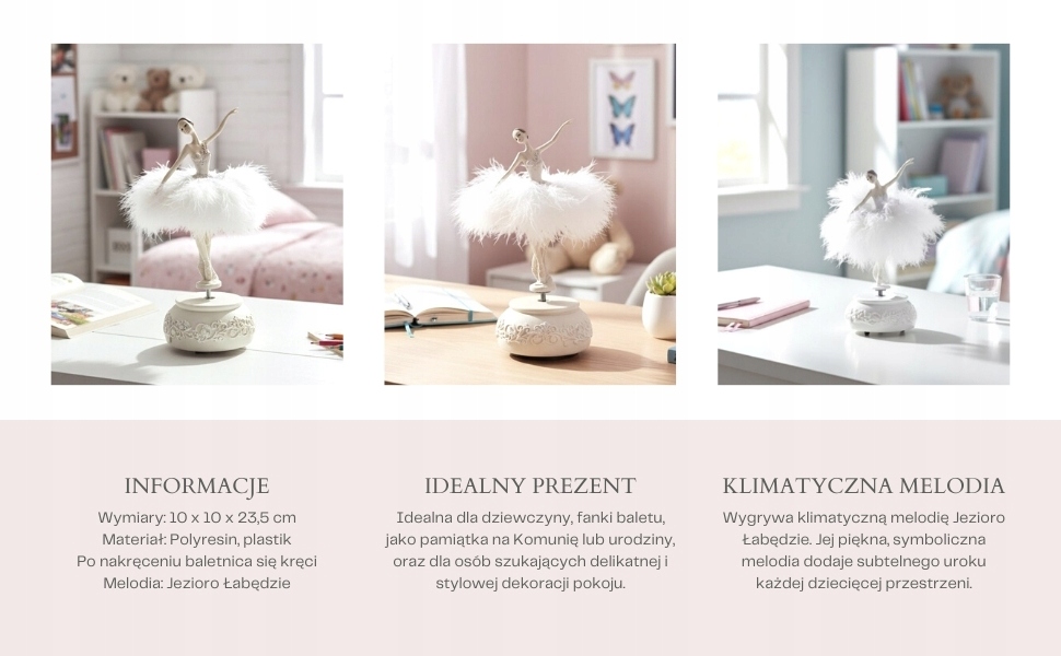 Ця незвичайна музична шкатулка - ідеальний подарунок для кожної жінки, яка цінує магію та класичну елегантність. Чарівна балерина в пишній білій сукні, кружляючи під мелодію «Лебединого озера», привнесе казкову атмосферу в будь-який інтер'єр.