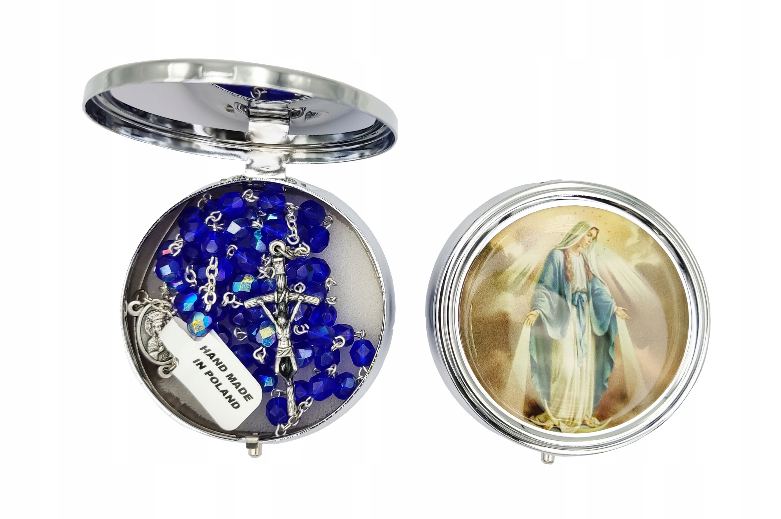 дуже добре зроблені сріблястий металевий коробка із зображенням Діви Марії Непотми