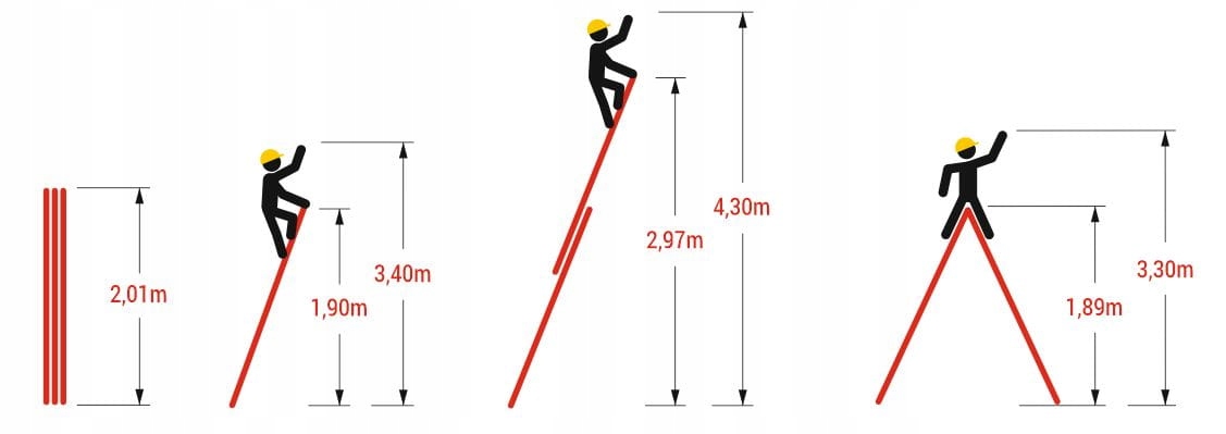 * Робоча висота є орієнтовним розміром, що показує очікувану висоту, до якої можна досягти зі сходів. Робоча висота дозволяє показати можливий діапазон даної драбини і є орієнтовним значенням, яке використовується більшості виробників.