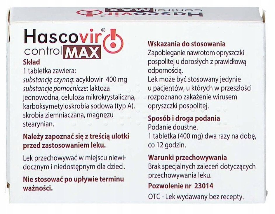 Hascovir control MAX використовується для профілактики рецидив простого герпесу у дорослиху яких в минулому була діагностована інфекція вірусу простого герпесу. Препарат призначений для пацієнтів з нормальним імунітетом.