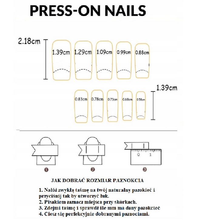 У комплект входить 24 нігті 12 розмірів, наклейка (двосторонній скотч для приклеювання нігтя) і міні-пилка