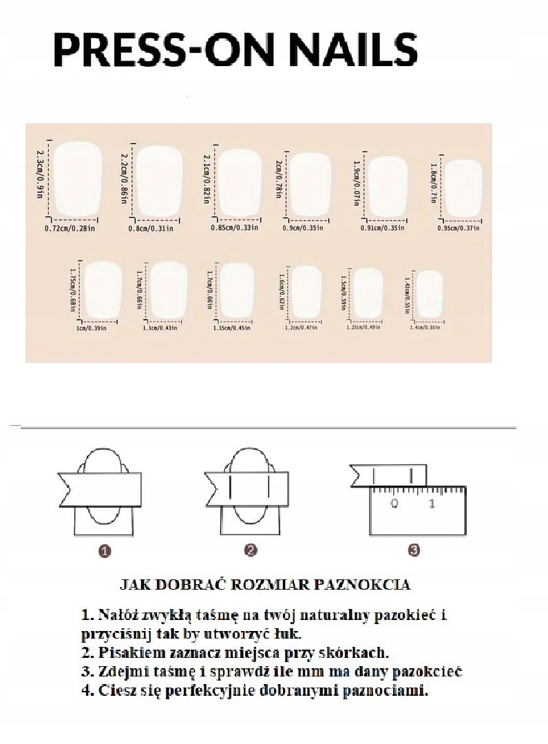 У комплект входить 24 нігті 12 розмірів, наклейка (двосторонній скотч для приклеювання нігтя) і міні-пилка