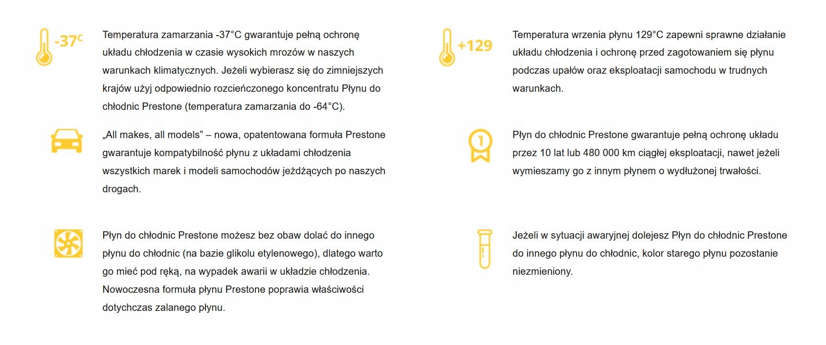Антифриз PRESTONE відповідає або перевищує всі стандарти виробника та міжнародні стандарти (включаючи стандарти ASTM, SAE, BSI, AFNOR, також адаптовані до VAG G12, G12+, G12++ та G13). Висока якість радіаторної рідини PRESTONE підтверджується тим фактом, що це рідина "OEM", тобто такі бренди, як Ford, GM і TOYOTA використовують її для першої заливки під час виробництва автомобілів.