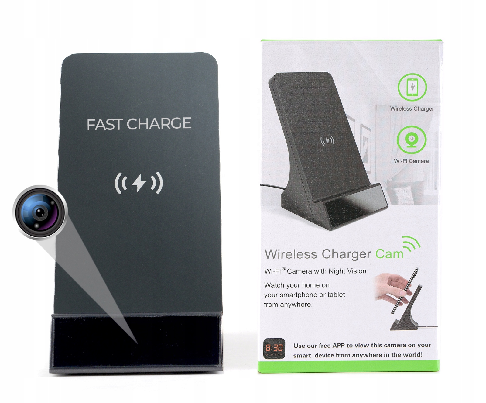 Пристрій працює і виглядає як індуктивний зарядний пристрій, але він також функціонує як прихована камера. Це сучасний зарядний пристрій, який не тільки дозволяє бездротово заряджати смартфон, але й дозволяє спостерігати за тим, що відбувається у вашому домі.