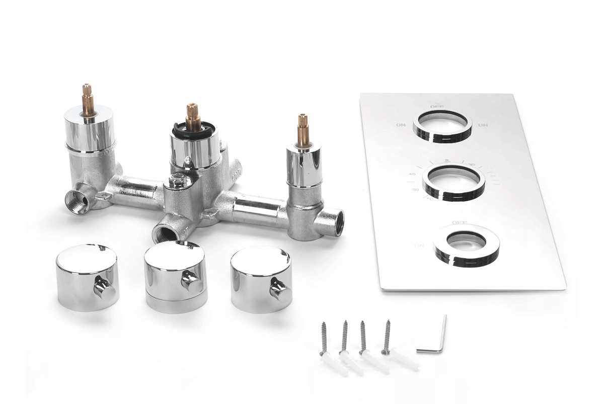 Серцем набору є 3-функціональний змішувач прихованого монтажу з термостатом від INEA. Корпус змішувача виготовлений з масивної латуні. Ручки виконані з хромованої нержавіючої сталі. Розетка виготовлена з нержавіючої сталі. Верхня ручка виконує дві функції.* Нижня ручка регулює тиск у гідромасажних форсунках. Термостат, який використовується в даній моделі, - головка від відомого бренду VERNET. Ручка термостата має функцію блокування на 38 градусах, після натискання кнопки можна встановити більш високу температуру. Замок призначений для запобігання випадковому опіку користувача струменем гарячої води.