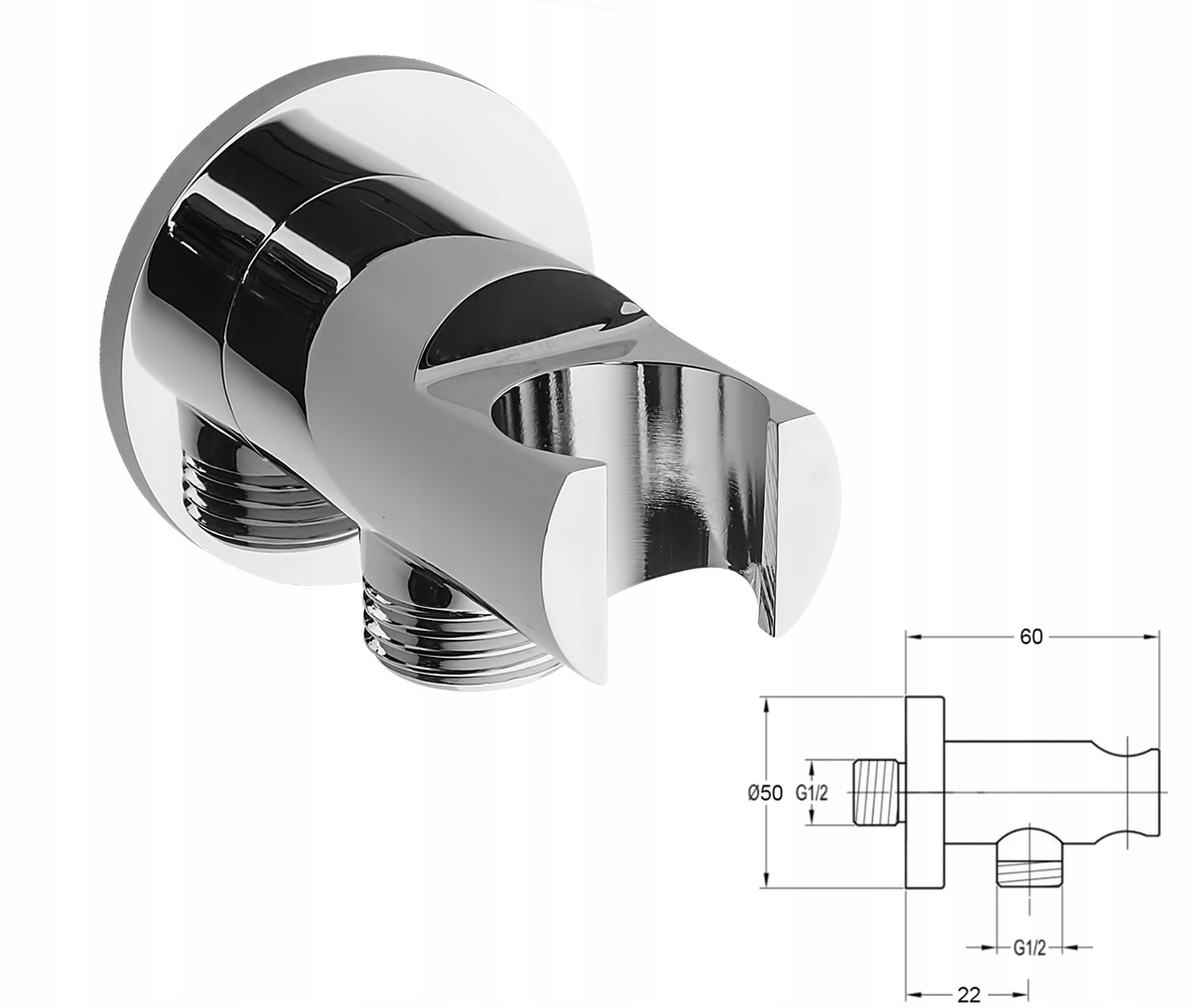 Кутовий з'єднувач INEA з латуні. З'єднання кілька разів хромоване, що надає цьому елементу виняткову міцність і блиск. Має маскувальну розетку діаметром 50 мм. Вхід і вихід води на стандартній різьбі 1/2". З'єднання має універсальний отвір для підвішування трубки, що дозволяє встановити будь-який шланг і трубку.