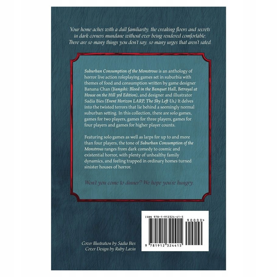 Приміське споживання жахливих - це антологія ігор жахів жахів, встановлених у передмісті з темами їжі та споживання, написаними дизайнером ігор Банана Чан (Цзянші: Кров у банкетному залі, зрада в будинку на пагорбі 3 -е видання), а також дизайнер та ілюстратор Садія Бієс (подія Horizon larp, Sky Lead Us). Він заглиблюється в скручені терори, що лежать за сеймінгглі -нормальною приміською обстановкою. У колекції є сольні ігри, ігри для двох гравців, ігри для трьох гравців, ігри для чотирьох гравців та ігри для високої гри.
