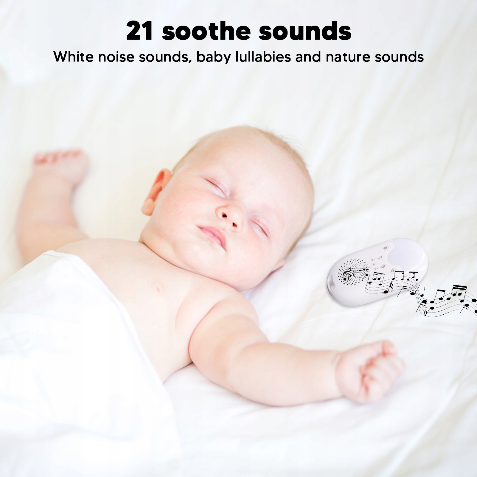 Функція: 1. Багатофункціональний: пристрій, що генерує білий шум з акумулятором, 21 заспокійливий звук, адаптовані таймери, різні рівні гучності, захист безпеки безпеки та навіть функція пам'яті.
