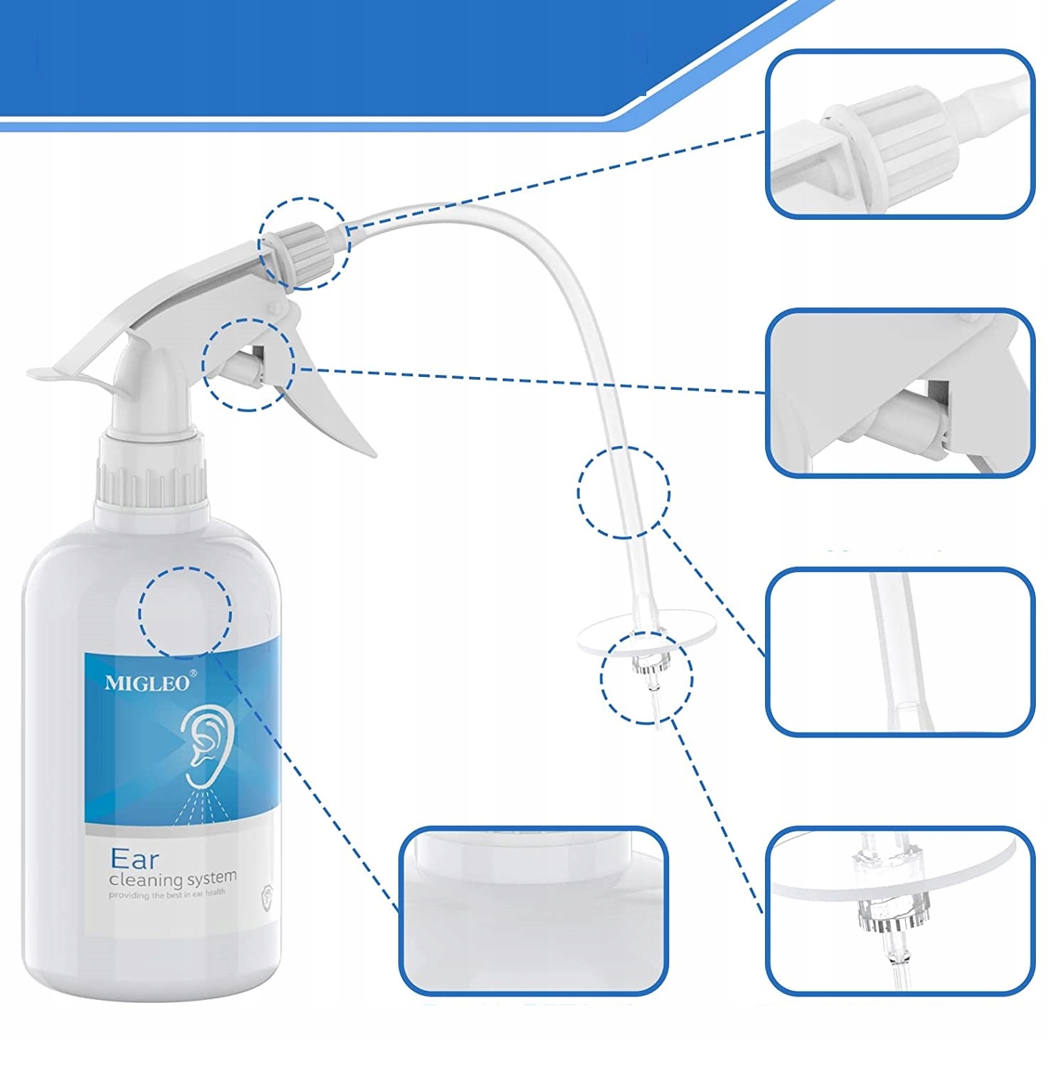 Ми взяли до уваги всі необхідні речі для миття вух вдома. Набір оснащений раковиною, 30 змінними кінчиками та пляшкою для зрошення. Досить дотримуватися інструкцій, щоб легко очистити вуха вдома.