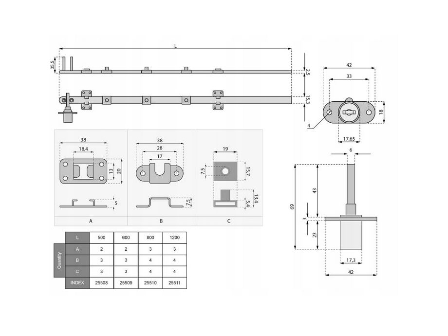 - фіксуючі планки (A) x 2 гачки (B) x 3 замок для ящика x3.