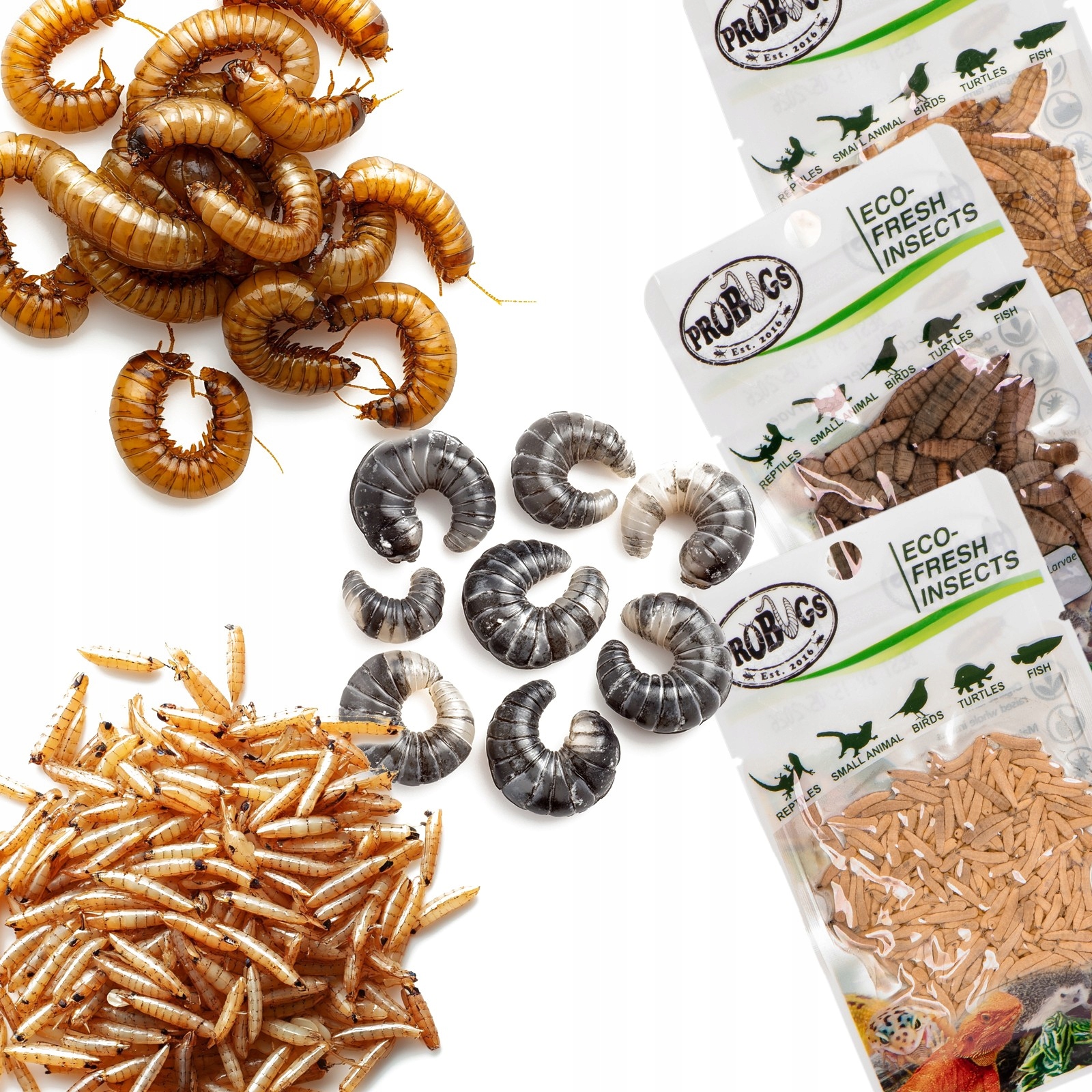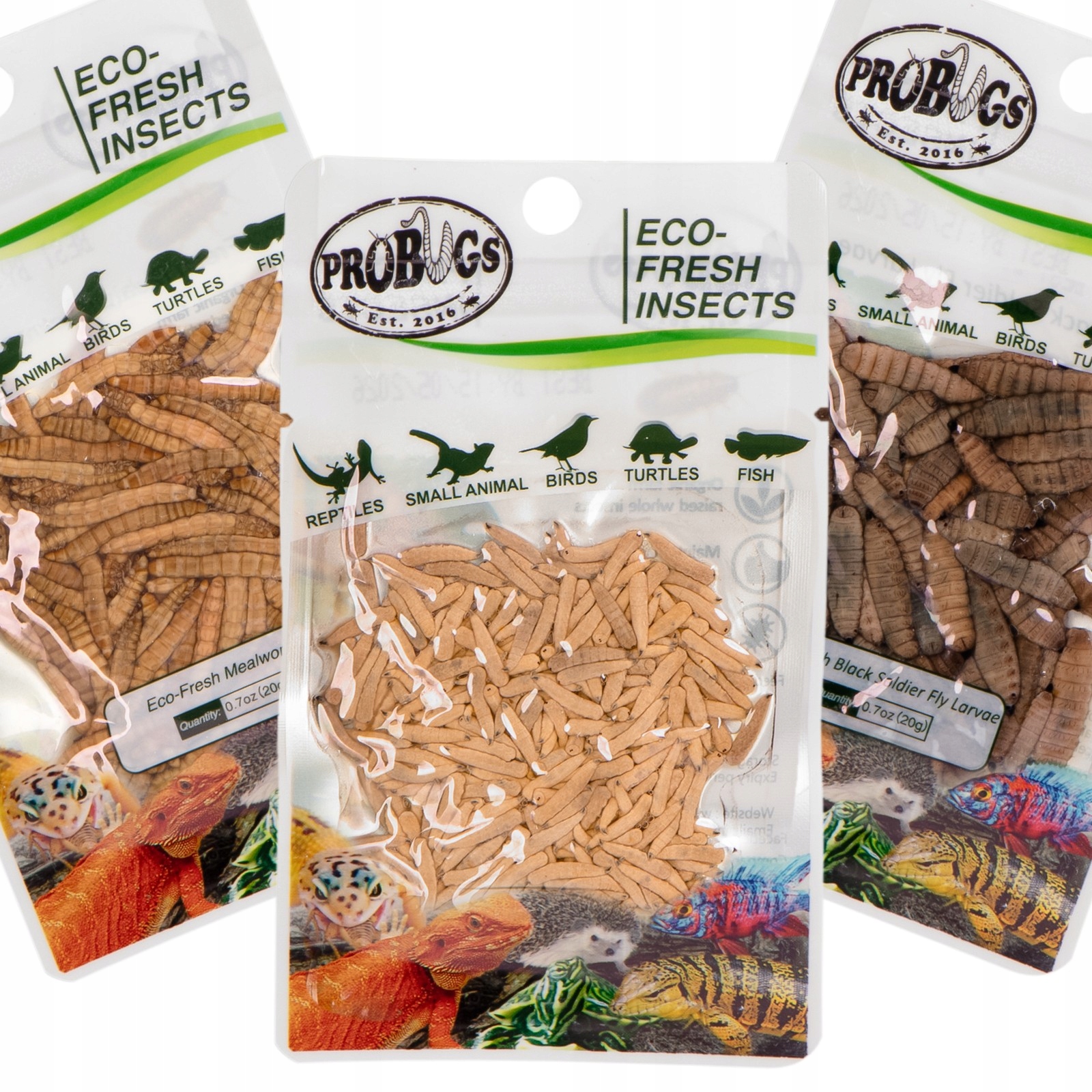 Свіжі, соковиті, наповнені поживною цінністю личинки мухи, личинки мошки та личинки борошняного хробака - натуральна їжа, яка немов жива та зберігає 100% поживної цінності! Немає порожніх висушених оболонок, як у висушених черв’яків, немає ризику захворювання, як у живих черв’яків. ProBugs гарантує, що ви годуєте свого вихованця здоровим, безпечним і м’ясним делікатесом.
