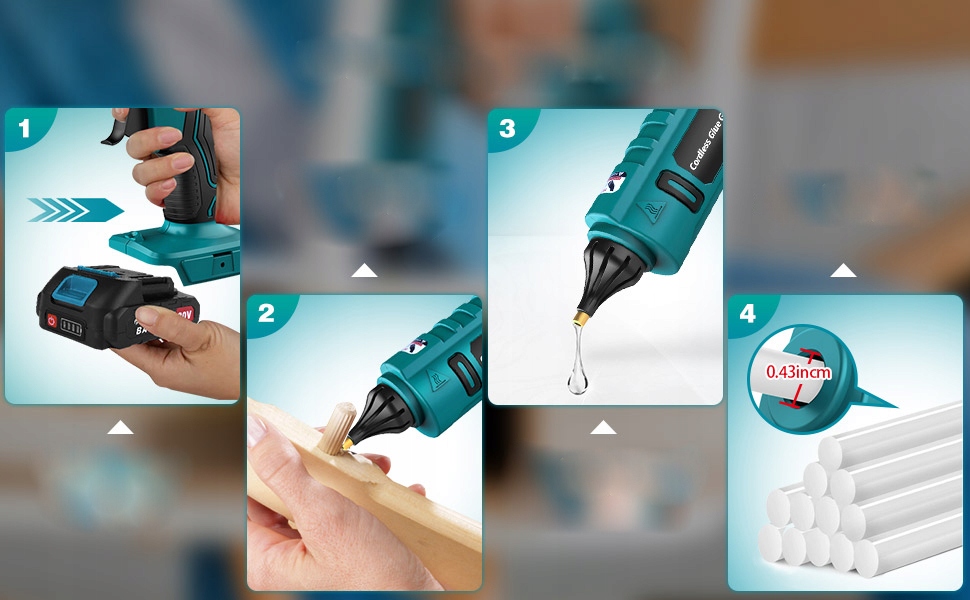 Десять бездротових пістолетів для склеювання є ідеальним рішенням для різних робіт, таких як майстерність, мистецтво, домашні елементи, створення основних елементів та подарунків. Він може добре працювати з пластиком, склом, папером, бавовною, тканиною та іншими матеріалами.