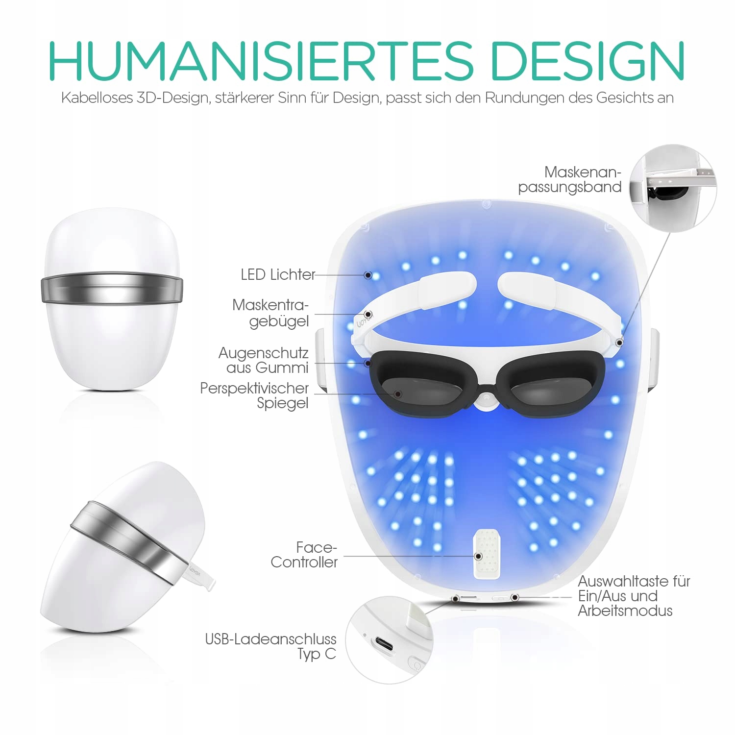 - 3 регульовані кольори – косметична маска діє глибоко в клітинах і омолоджує шкіру зсередини. Збільшення довжини хвилі фіолетового, синього та червоного кольорів дозволяє досягти різних ефектів догляду за шкірою та безпечно та ефективно вирішити проблеми зі шкірою. Наприклад, ви можете покращити тонкі лінії, відновити жирну шкіру, зменшити тьмяність і відновити пошкодження шкіри.