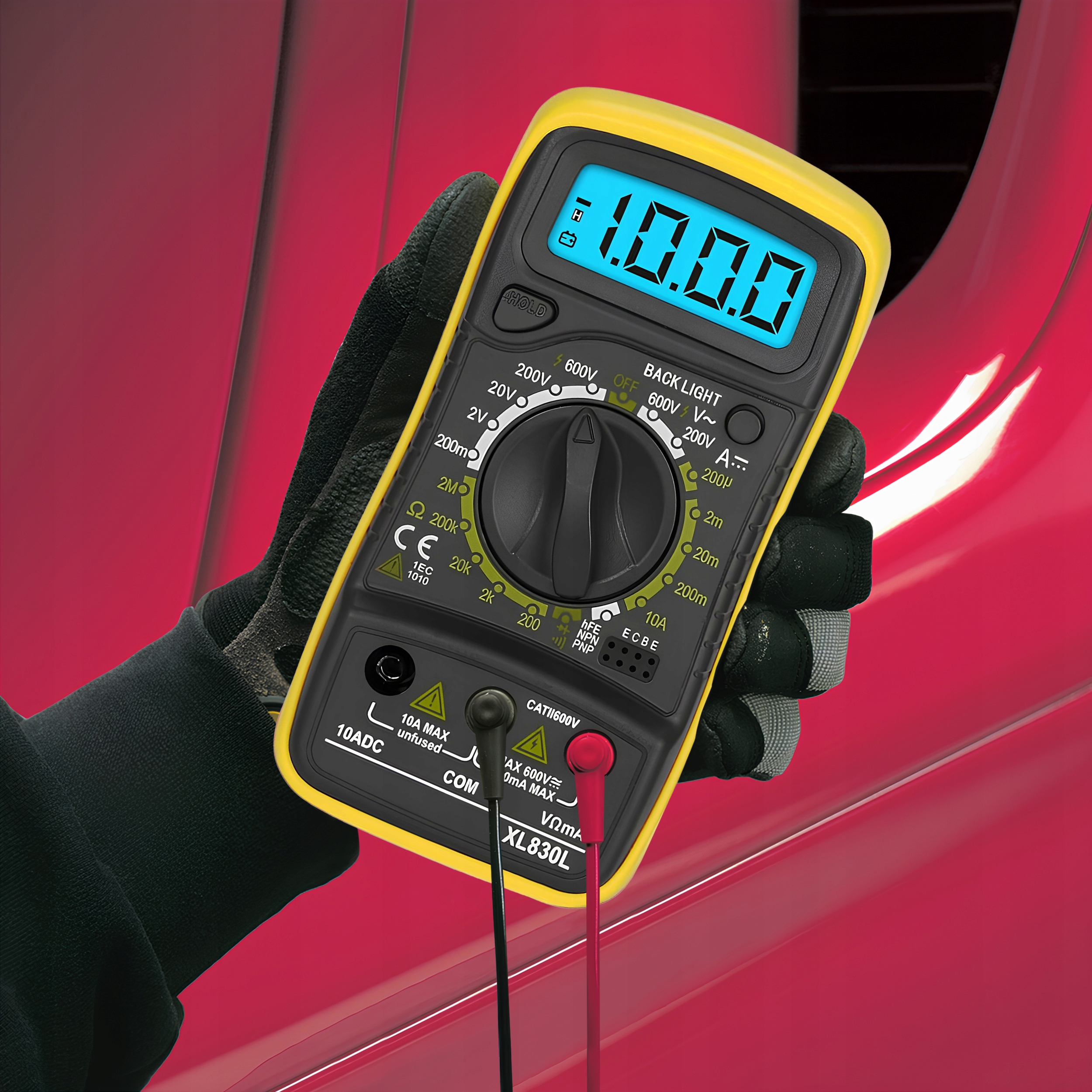 Мультиметр ідеально підходить для домашньої роботи, навчання, а також для професійних застосувань: від електроніки до встановлення автомобіля. Вимірювання напруги батареї, перевірка транзисторів, перевірка справності батареї - все у вас під рукою. Завдяки функції тестування hFE ви також розпізнаєте параметри транзисторів NPN і PNP.