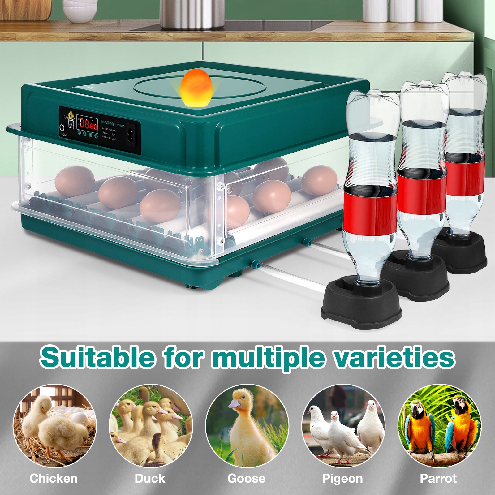 Інкубатор для яєць є повністю автоматичним, з контролем температури, автоматичним перевертанням яєць і наповненням водою, що робить його простим у використанні.