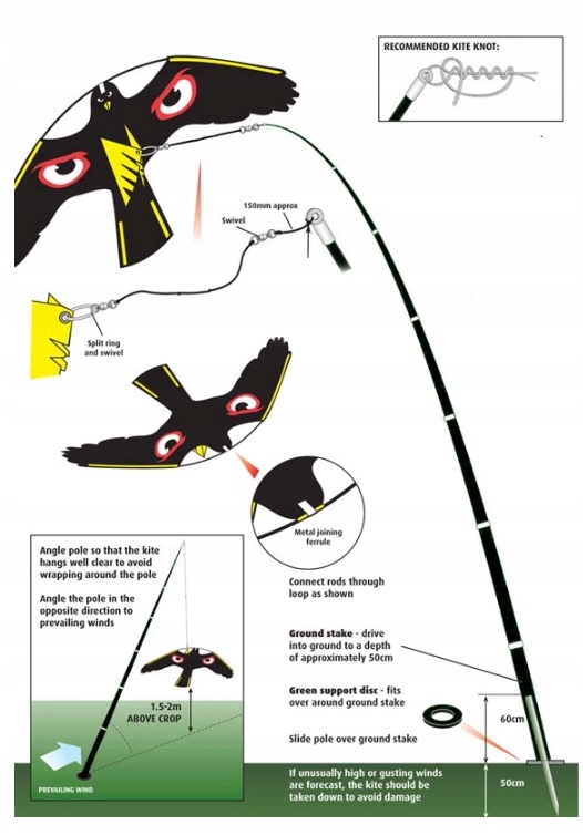 - повітряний змій злітає в повітря за швидкості вітру 2 км/год, макет пливе нерегулярно, що не дозволяє птахам звикнути до його присутності,