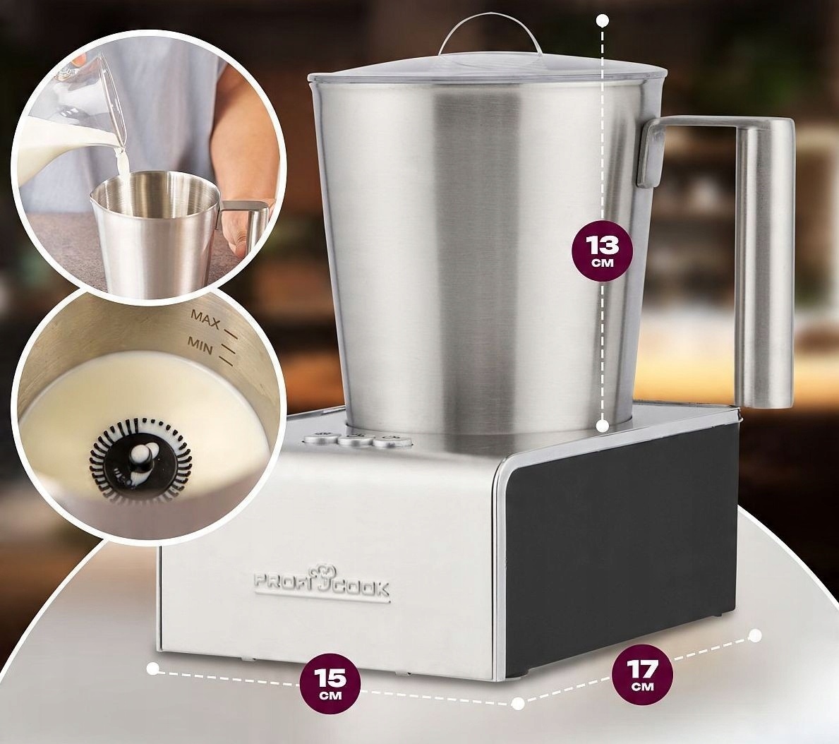 ProfiCook PC-MS є одним із найбільш практичних і популярних аксесуарів для приготування кави, особливо рекомендований для кава латте або капучино з ніжною пінкою. Пенювач нагріє молоко, а потім утворить густу пухнасту піну, яка залишається на поверхні напою.