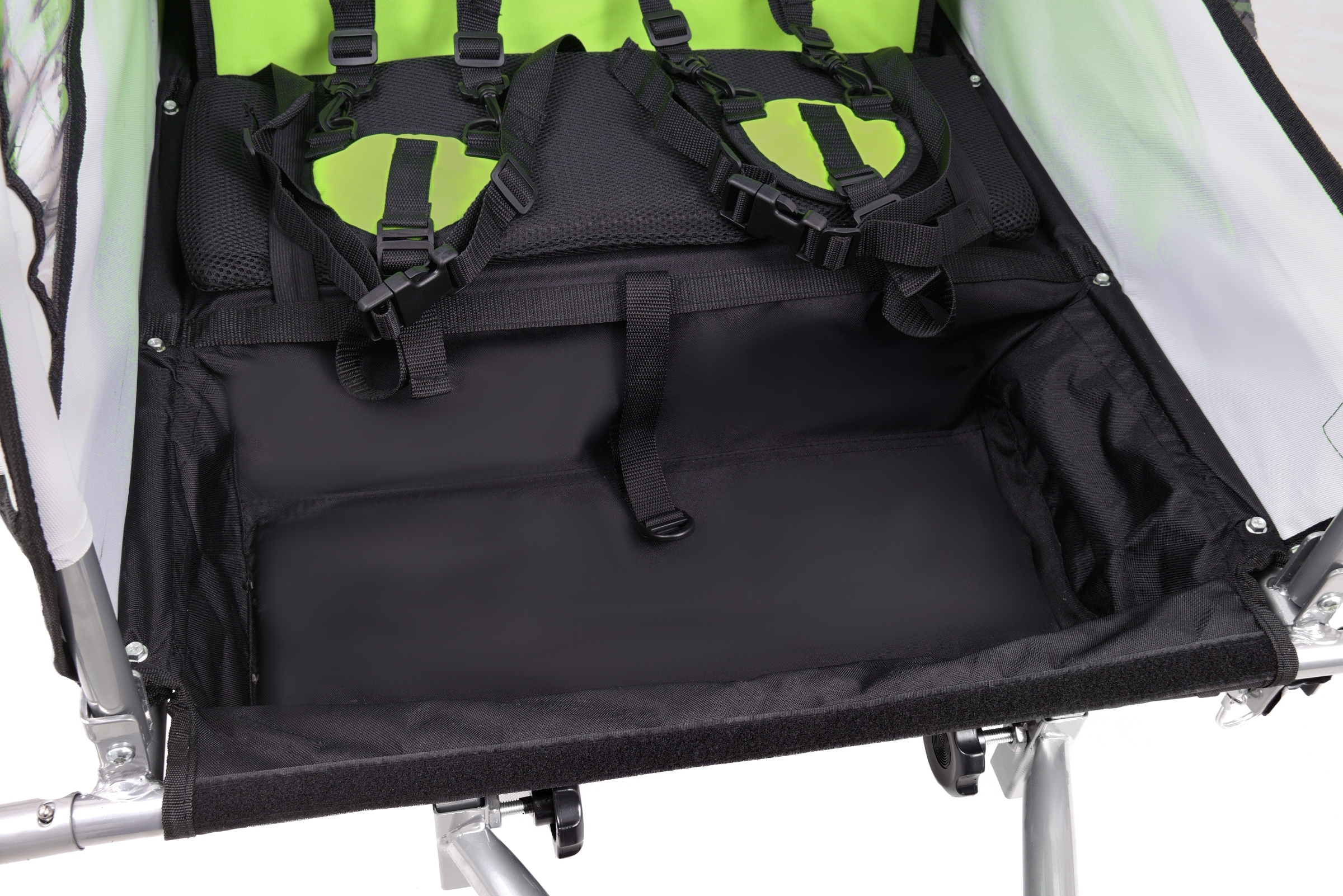 Внутрішня частина причепа оснащена ременями безпеки, що забезпечує безпеку наших дітей. На сидінні є подушка, що забезпечує зручне сидіння.