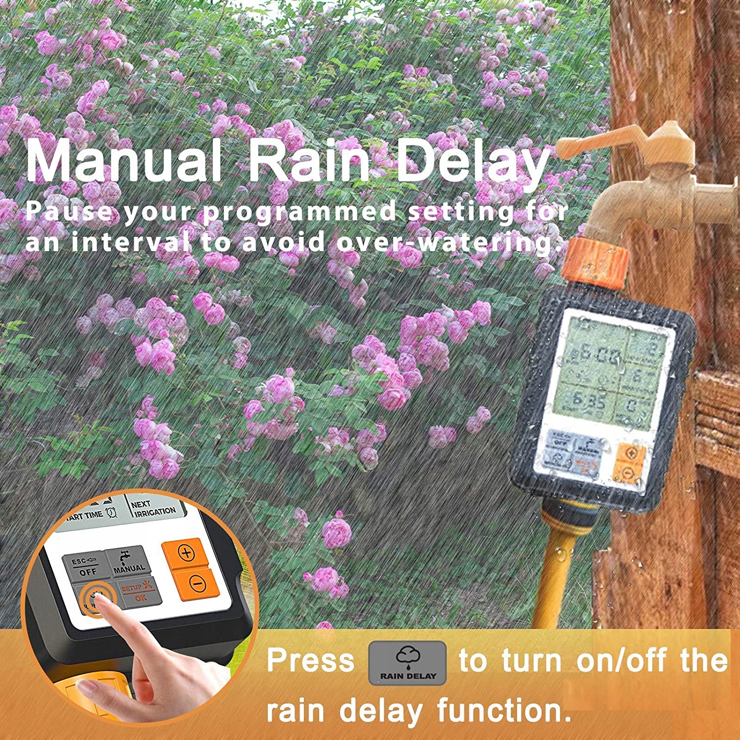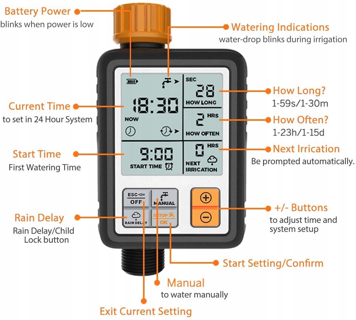 - Багатофункціональний та багатоцільовий Ручний режим дозволяє поливати миттєво, не перериваючи запланований графік поливу. Режим затримки дощу відкладе ваш графік до наступного циклу поливу, щоб уникнути надмірного поливу. Режим Baby Lock допомагає запобігти небажаному зливанню або втраті води. Цей спринклерний таймер можна використовувати для зрошення патіо, систем крапельного зрошення, поливання домашніх тварин і спринклерів тощо. операція протягом 30 секунд для значно більшої ефективності. Потужний чіп визначить низьку потужність і вимкне таймер змійки перед батареєю. реклама.